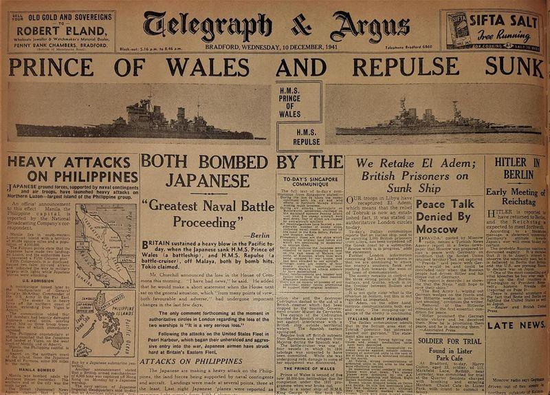 Στις 10 Δεκεμβρίου 1941 σημειώθηκε η βύθιση του νεότερου θωρηκτού HMS “Prince of Wales”, που είχε παραδοθεί μόλις τον Ιανουάριο του 1941, και του παλαίμαχου του Α΄Παγκοσμίου Πολέμου καταδρομικού HMS “Repulse” του βρετανικού Βασιλικού Ναυτικού από ιαπωνικά βομβαρδιστικά και τορπιλλοπλάνα, με αποτέλεσμα τον θάνατο 840 μελών των πληρωμάτων τους, μεταξύ των οποίων του κυβερνήτη του θωρηκτού Πλοιάρχου John Leach, αλλά και του Διοικητή της «Δυνάμεως Ζ» (“Force Z”) Ναυάρχου Sir Thomas Phillips, ο οποίος επέβαινε στο θωρηκτό με το επιτελείο του.