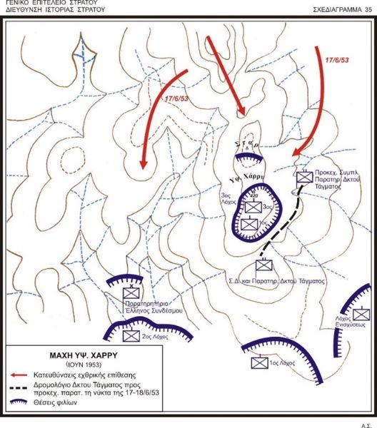 Στις 16 Ιουνίου 1953 λοιπόν, οι 110 Έλληνες μαχητές με επικεφαλής τον έμπειρο και μπαρουτοκαπνισμένο Λοχαγό τους φτάνουν στην κορυφή του υψώματος, στις θέσεις των Αμερικανών (Πορτορικανών) και αναλαμβάνουν να υπερασπιστούν το θρυλικό, όπως εξελίχθηκε, ύψωμα «Χάρρυ». Όταν ανέβηκαν στο ύψωμα δεν βρήκαν ουσιαστικώς χαρακώματα παρά μόνο πτώματα, με αποτέλεσμα να μην μπορούν να αναπνεύσουν από τη δυσοσμία.