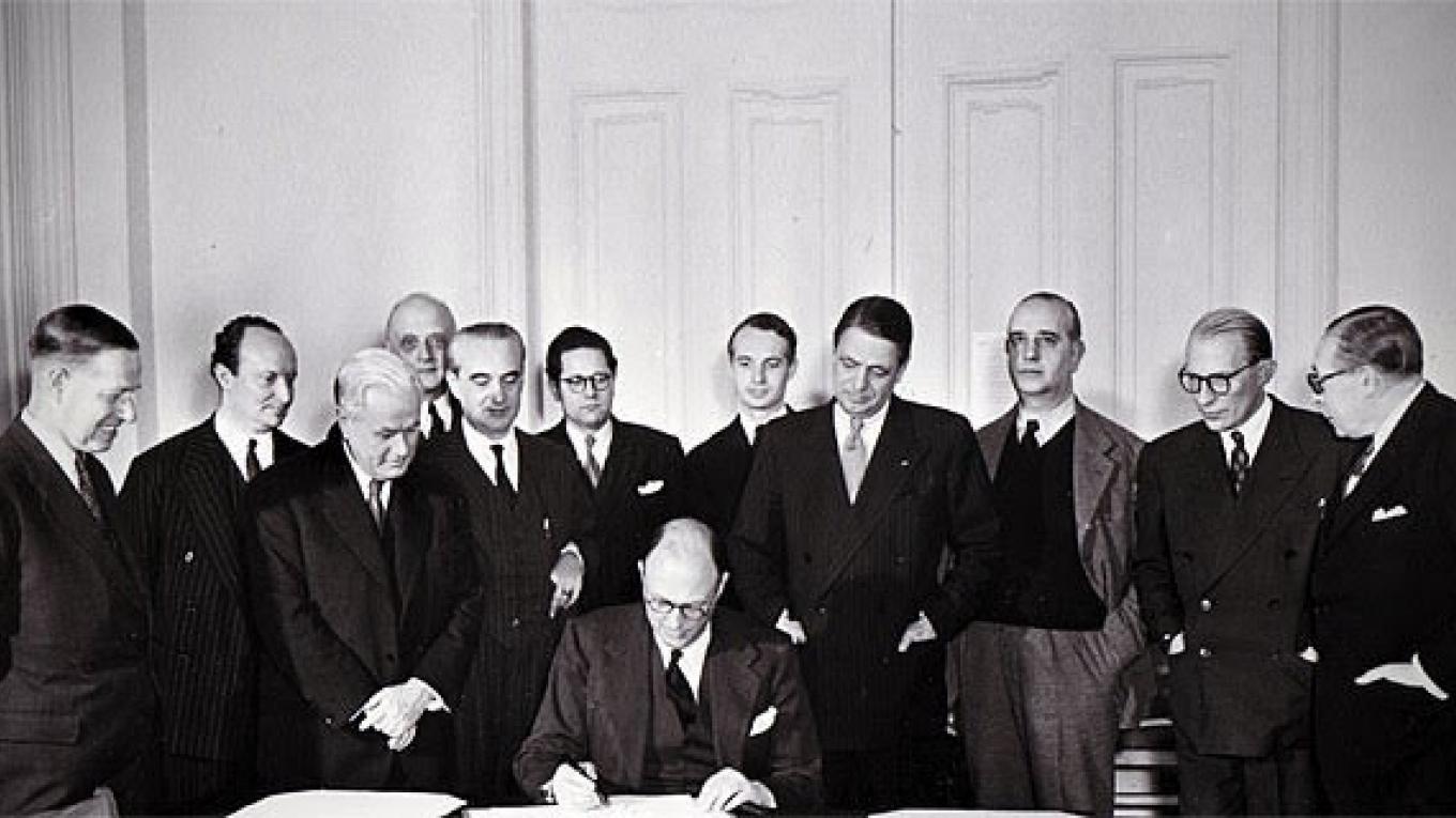 Στις 4 Απριλίου 1949, η υπογραφή στην πρωτεύουσα των ΗΠΑ Ουάσινγκτων, από 12 κράτη (ήτοι Βέλγιο, Ηνωμένο Βασίλειο, Γαλλία, Δανία, ΗΠΑ, Ισλανδία, Ιταλία, Καναδά, Λουξεμβούργου, Νορβηγία, Ολλανδία, Πορτογαλία), η ομώνυμη «Συνθήκη της Ουάσιγκτων», η οποία και αποτελεί την πράξη ιδρύσεως του «Οργανισμού Βορειοατλαντικού Συμφώνου» (North Atlantic Treaty Organization/ ΝΑΤΟ).