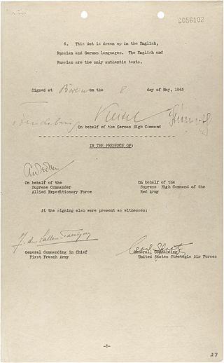 Στις 8 Μαΐου 1945, ο Στρατάρχης Βίλχεμ Κάϊτελ, κατ’ εντολή του Αρχιναυάρχου Καρλ Νταίνιτς, ο οποίος είχε διαδεχθεί τον αυτοκτονήσαντα στο καταφύγιο της Καγκελαρίας Αδόλφο Χίτλερ στην ηγεσία της Ναζιστικής Γερμανίας, υπόγραψε την άνευ όρων παράδοση της χώρας του, τερματίζοντας έτσι επισήμως τις πολεμικές συγκρούσεις του Β’ΠΠ στο ευρωπαϊκό θέατρο των επιχειρήσεων (VE Day) στο Κάρλσορστ έξω από το Βερολίνο, εκεί όπου ήταν οι εγκαταστάσεις της Σχολής Μηχανικού του Γερμανικού Στρατού και αργότερα (μέχρι σήμερα) ήταν το Γερμανο-Σοβιετικό Μουσείο. Στο πρωτόκολλο της άνευ όρων παραδόσεως της Ναζιστικής Γερμανίας, υπήρχε η φράση: «Όλες οι δυνάμεις κάτω από γερμανικό έλεγχο θα παύσουν τις ενεργές επιχειρήσεις τους στις 23:01, ώρα Κεντρικής Ευρώπης, της 8ης Μαΐου 1945».