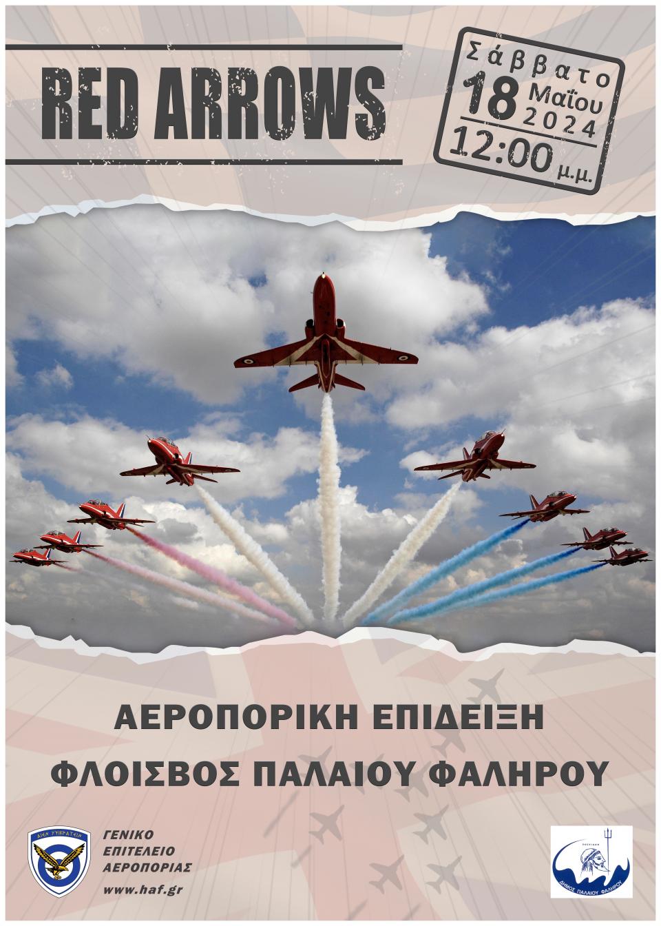 Αεροπορική επίδειξη του φημισμένου ακροβατικού Σμήνους των Red Arrows (= «Κόκκινα Βέλη») της RAF πρόκειται να πραγματοποιηθεί στο Φλοίσβο του Παλαιού Φαλήρου στις 18 Μαΐου, όπως έγινε σήμερα γνωστό από το Γενικό Επιτελείο Αεροπορίας.