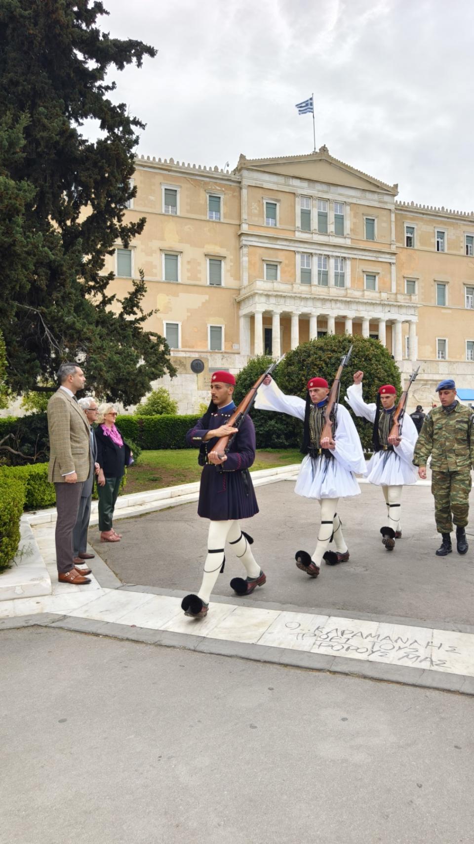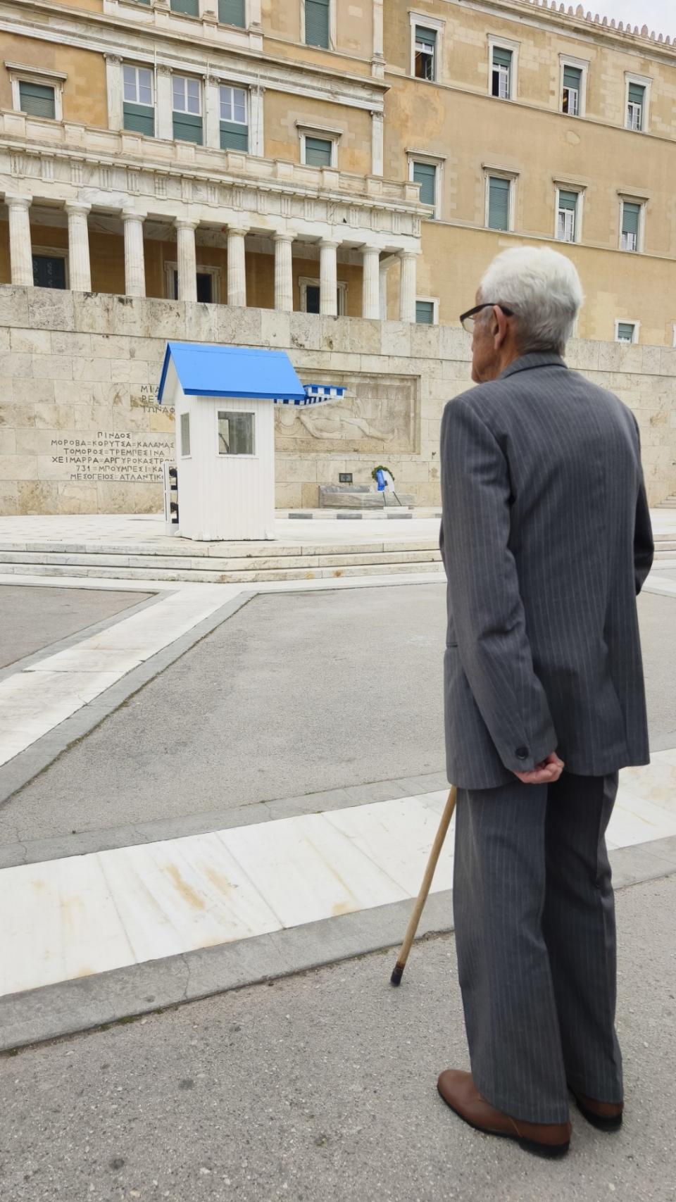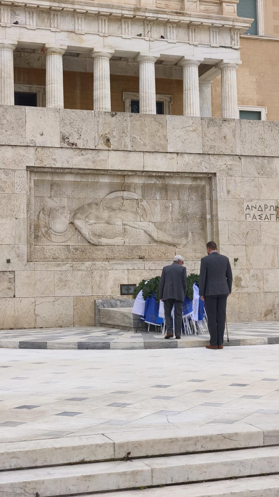 Ο κ. Τσικόπουλος έφτασε μπροστά στο Μνημείο του Αγνώστου Στρατιώτη, συνοδευόμενος από τον Πρόεδρο του Συλλόγου Ευζώνων Προεδρικής Φρουράς κ. Νίκο Γαβριλάκη, στον οποίο έδωσε το μπαστούνι πήρε το δάφνινο στεφάνι και το κατέθεσε στο Μνημείο, ιστάμενος σε στάση προσοχής, με το χέρι στην καρδιά και χωρίς τη βοήθεια κανενός, φανερά συγκινημένος!