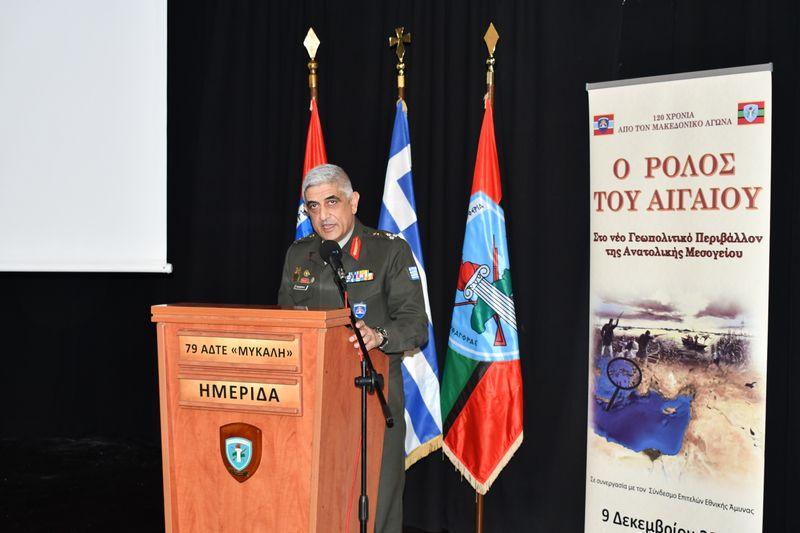 Επιμορφωτική ημερίδα με θέμα «Ο ρόλος του Αιγαίου Πελάγους στο νέο γεωπολιτικό περιβάλλον της Ανατολικής Μεσογείου, 120 έτη μετά την έναρξη του Μακεδονικού Αγώνα», πραγματοποιήθηκε στην έδρα της 79ης Ανωτέρας Διοικήσεως Ταγμάτων Εθνοφυλακής (79 ΑΔΤΕ) στη Σάμο, παρουσία του Διοικητή της Ανώτατης Στρατιωτικής Διοικήσεως Εσωτερικού και Νήσων (ΑΣΔΕΝ) Αντιστρατήγου Εμμανουήλ Θεοδώρου.