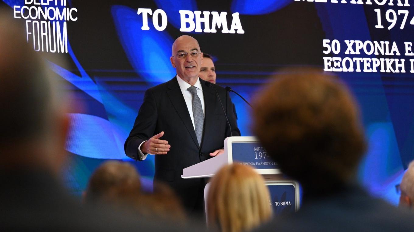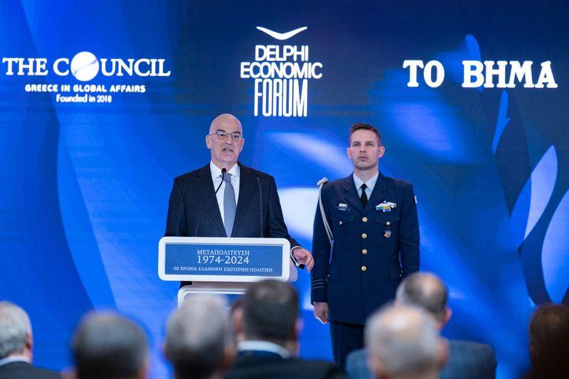 Ο κ. Δένδιας, στην ομιλία του με θέμα «Στρατηγική Εθνικής Ασφάλειας την πεντηκονταετία» προλόγισε ο κ. Συμεών Γ. Τσομώκος, ιδρυτής και Πρόεδρος του Οικονομικού Φόρουμ των Δελφών, αναφέρθηκε στη στρατηγική εθνικής ασφαλείας της χώρας, παρουσιάζοντας μια συνολική αποτίμηση του παρελθόντος, αλλά και τις προκλήσεις που αντιμετωπίζει η χώρα στον τομέα της εξωτερικής πολιτικής και της άμυνας.