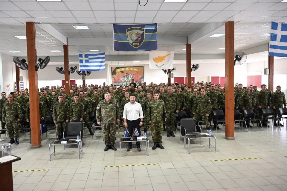 Κάτι το οποίο θεωρώ πολύ σημαντικό και απευθύνομαι στα παλικάρια που κάνουν τη στρατιωτική τους θητεία εδώ. Πολλές φορές αντιλαμβάνομαι τη στεναχώρια τους, διότι κάποιοι άλλοι, οι περισσότεροι, βρίσκονται πίσω κοντά στις οικογένειές τους, στη βολή τους, στην καθημερινότητά τους. Ίσως να αισθάνεστε μία νοσταλγία και μία αδικία. Θέλω να σας διαβεβαιώσω κάτι. Όταν θα τελειώσει αυτό το ταξίδι και επιστρέψετε στις οικογένειες σας, να ξέρετε το συναίσθημα που θα έχετε για το υπόλοιπο της ζωής σας από τις ιστορίες που θα διηγείστε στα παιδιά σας, στα εγγόνια σας και τους φίλους σας, θα σας καθιστά ξεχωριστούς. Και να είστε υπερήφανοι που βρίσκεστε εδώ, σε αυτό το νησί, που είμαι σίγουρος ότι έχετε επισκεφθεί όλους τους μεγάλους τόπους θυσίας». Και πρόσθεσε: «Να θυμάστε κάτι: Στην Πατρίδα τίποτα δεν υπήρξε αυτονόητο, τίποτα δεν μας χαρίστηκε στο βάθος των αιώνων. Και εάν είχαμε συμμαχίες, και εάν είχαμε φιλίες, όλες τις μεγάλες μάχες τις δίναμε μόνοι μας. Και για αυτό να προετοιμάζεστε, και για αυτό να συνηθίζετε. Και για αυτό θα συνεχίσουμε να είμαστε κοντά σας και να σας διαβεβαιώνουμε μέσα από τη συγκεκριμένη στρατηγική μας και πολιτική, ότι εάν ποτέ χρειαστεί θα έχετε όλα όσα χρειάζεστε για να μπορέσετε να κρατήσετε ψηλά τη Σημαία…».