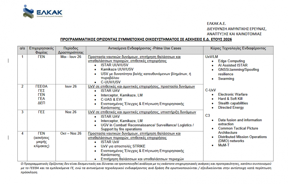 Μία πρωτοβουλία προς τη σωστή κατεύθυνση, που πραγματοποιείται «στο πλαίσιο της συστηματικής ενίσχυσης της επιχειρησιακής ικανότητας των Ενόπλων Δυνάμεων και της κάλυψης επειγουσών αναγκών μέσω της αξιοποίησης της εγχώριας καινοτομίας, το ΕΛΚΑΚ, σε συνεργασία και συντονισμό με το ΓΕΕΘΑ και τα Γενικά Επιτελεία, προσκαλεί το αμυντικό οικοσύστημα να συμμετάσχει σε επιλεγμένες στρατιωτικές ασκήσεις, προκειμένου να δοκιμάσει τα συστήματά του σε ρεαλιστικές συνθήκες δίπλα στις Ένοπλες Δυνάμεις της Χώρας.», όπως σημειώνεται χαρακτηριστικώς.