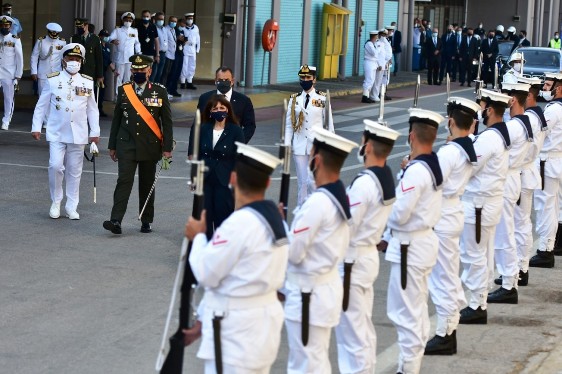 Η κ. Σακελλαροπούλου επιβιβάστηκε στη φρεγάτα «ΥΔΡΑ», όπου την υποδέχθηκαν ο υπουργός Εθνικής 'Αμυνας Νικόλαος Παναγιωτόπουλος, ο υφυπουργός Εθνικής 'Αμυνας Αλκιβιάδης Στεφανής, ο αρχηγός ΓΕΕΘΑ Στρατηγός Κωνσταντίνος Φλώρος, ο αρχηγός ΓΕΝ Αντιναύαρχος Στυλιανός Πετράκης, ο αρχηγός Στόλου Αντιναύαρχος Παναγιώτης Λυμπέρης, τα μέλη του Ανώτατου Ναυτικού Συμβουλίου και ο κυβερνήτης της φρεγάτας αντιπλοίαρχος Διονύσης Αρτεμάκης. Όπως τόνισε «εθνική υπερηφάνεια είναι το αίσθημα που κυριαρχεί μετά την επιθεώρηση του Στόλου. Υπερηφάνεια και σεβασμός προς τους άνδρες και τις γυναίκες του Πολεμικού μας Ναυτικού, που υπηρετούν το έθνος με αφοσίωση, υψηλό φρόνημα και αυταπάρνηση». Παράλληλα, υπογράμμισε ότι «οι σύγχρονοι Θεμιστοκλείς υπερασπίζονται με αποτελεσματικότητα τα θαλάσσια σύνορα της πατρίδας μας και της Ευρώπης απέναντι σε προκλήσεις και απειλές της εθνικής μας ακεραιότητας, όπως το καλοκαίρι του 2020, διασφαλίζοντας τα κυριαρχικά μας δικαιώματα. Τους είμαστε ευγνώμονες για την προσφορά τους».