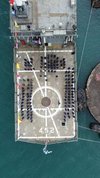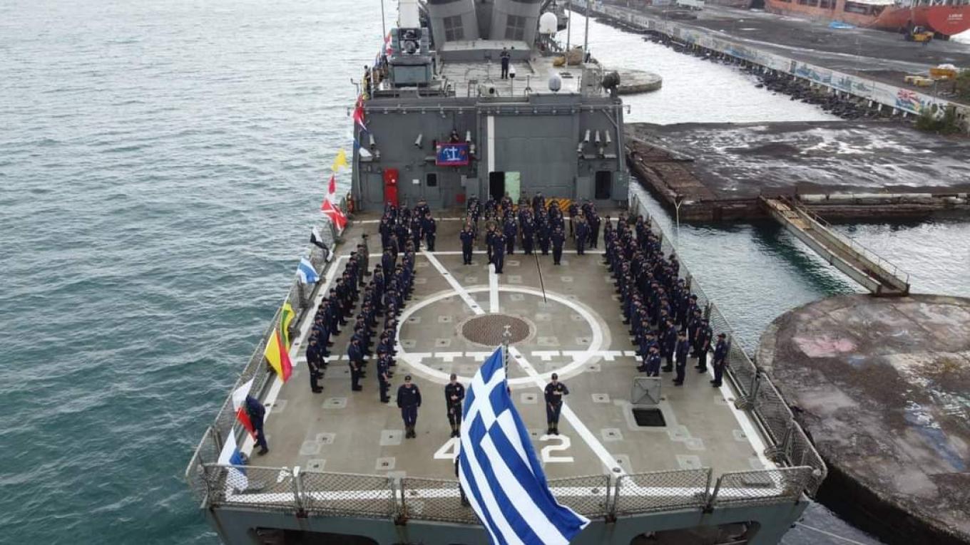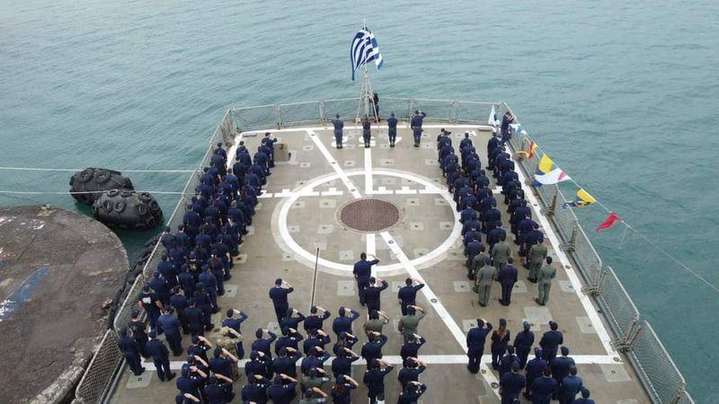 Πραγματοποιήθηκε κλήση του πληρώματος στο ελικοδρόμιο, στην πρύμνη του σκάφους, έπαρση της Ελληνικής Σημαίας, σύντομος χαιρετισμός και ευχές από τον κυβερνήτη Αντιπλοίαρχο ΧΔ και…συνέχιση της αποστολής!