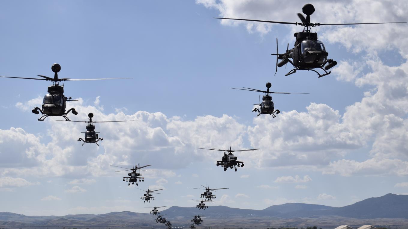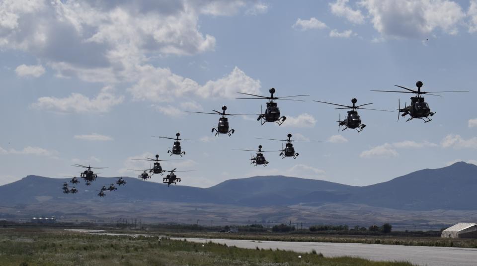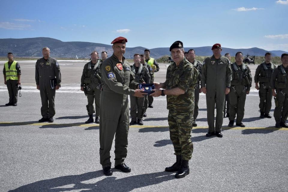 Σε αυτές τις δύο φωτογραφίες (την μία βλ΄πεται επάνω την άλλη κάτω), που έχουν ληφθεί από την επίσκεψη του Στρατηγού Λαλούση στην έδρα της 1ης ΤΑΞΑΣ, στο Στεφανοβίκι Μαγνησίας, διακρίνονται σε ταυτόχρονη απογείωση ένας σχηματισμός αποτελούμενος από 22 ελικόπτερα, από τα οποία τα 14 είναι επιθετικά ελικόπτερα AH-64A+ Apache και τα υπόλοιπα 8 από τα νεώτερα επιθετικής αναγνωρίσεως OH-58D Kiowa Warrior!