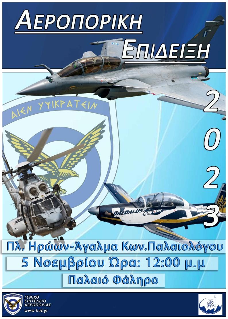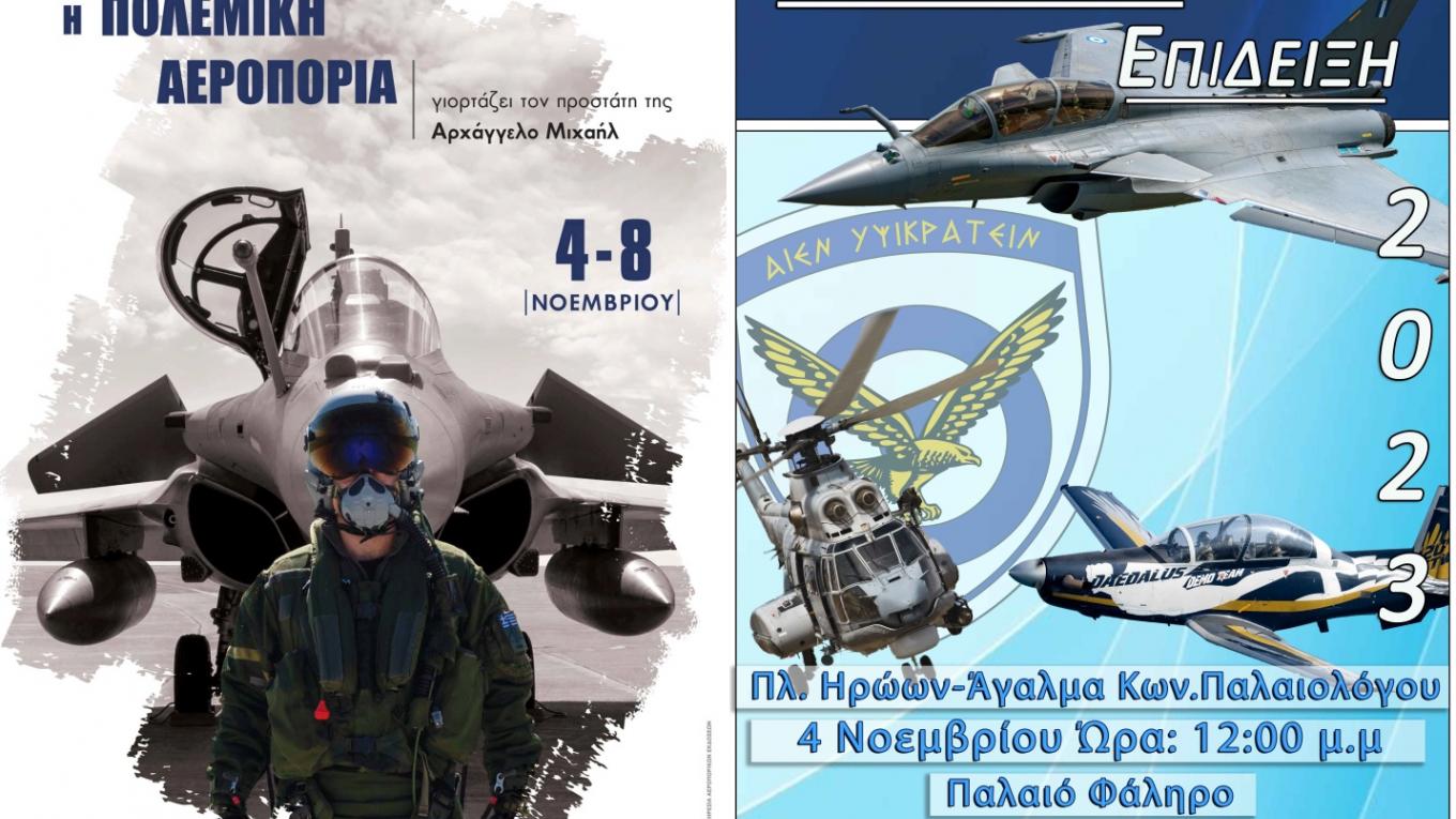 Μετατέθηκε κατά μία ημέρα, και από το Σάββατο 4 Νοεμβρίου που ήταν προγραμματισμένη, θα γίνει τώρα την Κυριακή 5 του μηνός στον ίδιο χώρο, η αεροπορική επίδειξη στο Φλοίσβο του Παλαιού Φαλήρου, στο πλαίσιο του εορτασμού του Προστάτη της Πολεμικής Αεροπορίας Αρχαγγέλου Μιχαήλ, λόγω των δυσμενών καιρικών συνθηκών, που προβλέπεται να επικρατούν στην περιοχή της επιδείξεως.