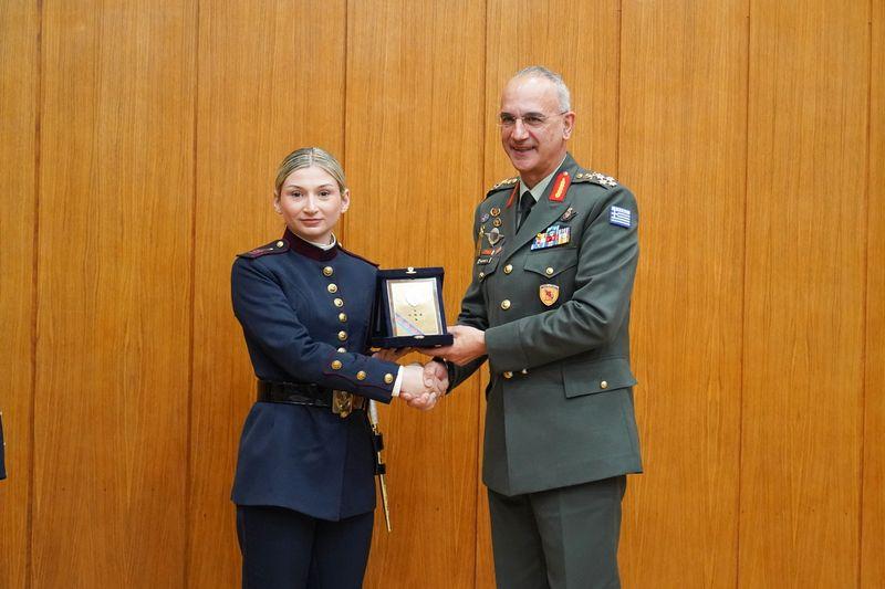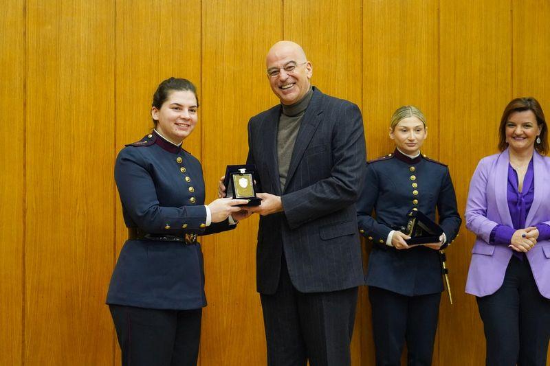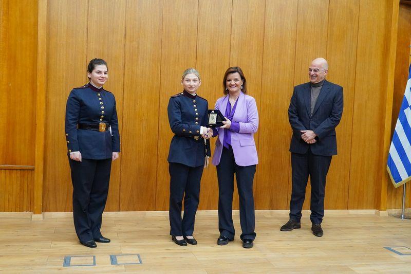 - Στο πλαίσιο της προαναφερθείσας εκδηλώσεως ο κ. Δένδιας,συνοδευόμενος από την κ. Κεφάλα,βράβευσε με την «Ηθική Αμοιβή» του «Επαίνου», δύο σπουδάστριες της Στρατιωτικής Σχολής Αξιωματικών Σωμάτων (ΣΣΑΣ) για την διάκριση τους στους τομείς της ακαδημαϊκής εκπαιδεύσεως και της κοινωνικής προσφοράς αντίστοιχα.