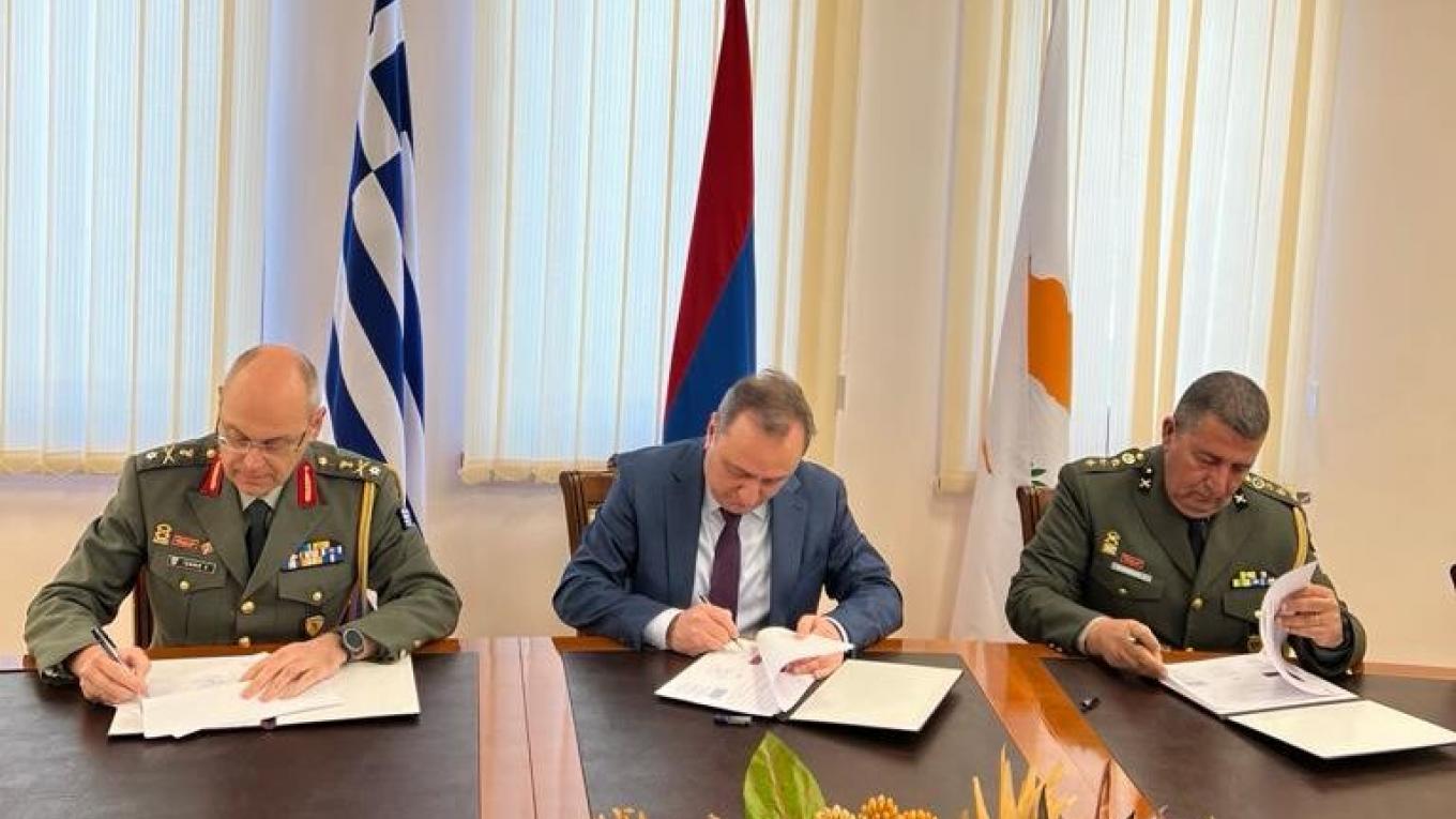 Το κοινό σχέδιο δράσης Ελλάδος - Κύπρου - Αρμενίας για το 2024 υπεγράφη στις 18 Δεκεμβρίου στο Ερεβάν από τον διευθυντή της Διεύθυνσης Διεθνών Σχέσεων του ΓΕΕΘΑ ταξίαρχο Βασίλειο Τσάμη, τον διευθυντή του Δ' Κλάδου του Γενικού Επιτελείου Εθνικής Φρουράς της Κύπρου συνταγματάρχη (ΠΒ) Αλκιβιάδη Αλκιβιάδη και τον επικεφαλής του Τμήματος Αμυντικής Πολιτικής και Διεθνών Συνεργασιών του υπουργείου 'Αμυνας της Αρμενίας Levon Ayvazyan.