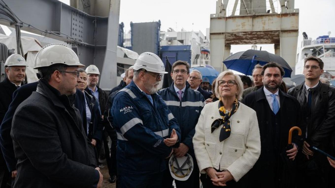Προηγουμένως η κα Βοτρέν και αμέσως μετά το πέρας του γεύματος που της παρετέθη στο καρέ των αξιωματικών της Φ/Γ «ΚΙΜΩΝ», που ήταν παραβεβλημένη στο Ναύσταθμο Σαλαμίνος, επισκέφθηκε τα σε μικρή απόσταση από το Ναύσταθμο ευρισκόμενα Ναυπηγεία Σαλαμίνος, που συνεργάζονται στενότατα με την κατασκευάστρια των φρεγατών FDI (FR και HN) Naval Group, κατασκευάζοντας μάλιστα πέντε από τους 11 συνολικώς προκατασκευασμένους τομείς, από τους οποίους αποτελείται μία φρεγάτα του προαναφερθέντος τύπου.