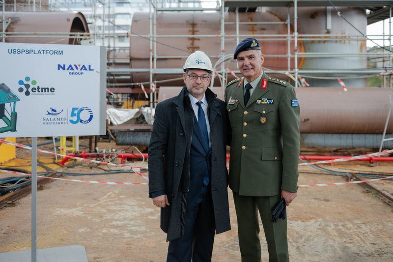Εκεί της παρουσιάστηκε η πρόοδος των εργασιών κατασκευής της μη επανδρωμένης πλωτής εξέδρας θαλασσίας επιτηρήσεως USSPS (Unmanned Semi-fixed Sea Platform), παρουσία του Γενικού Διευθυντού της Γενικής Διευθύνσεως Αμυντικών Εξοπλισμών και Επενδύσεων (ΓΔΑΕΕ) Υποστρατήγου Ιωάννη Μπούρα και του Διευθύνοντος Συμβούλου της Naval Group κ. Πιέρ – Ερίκ Πομελέ με πολυμελή γαλλική αντιπροσωπεία.