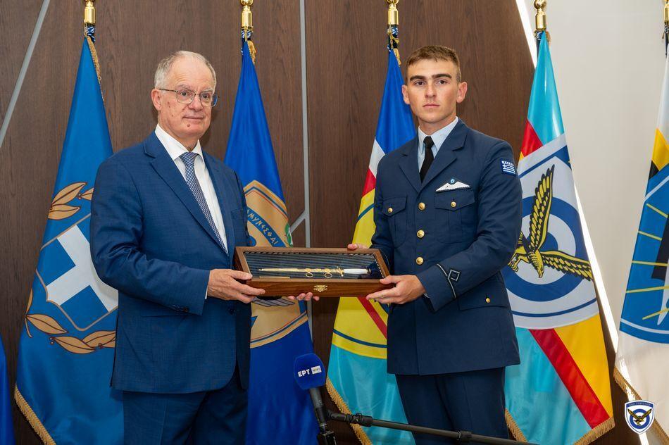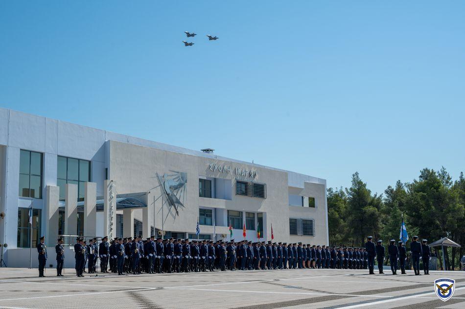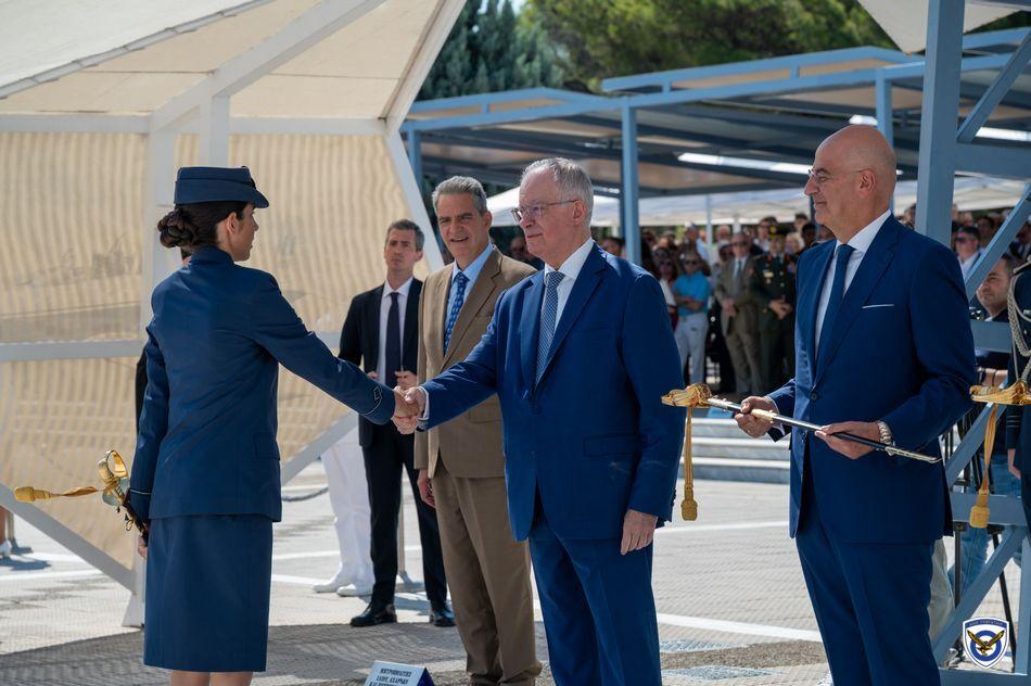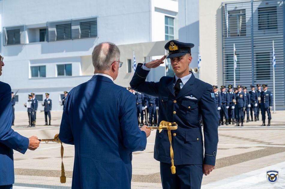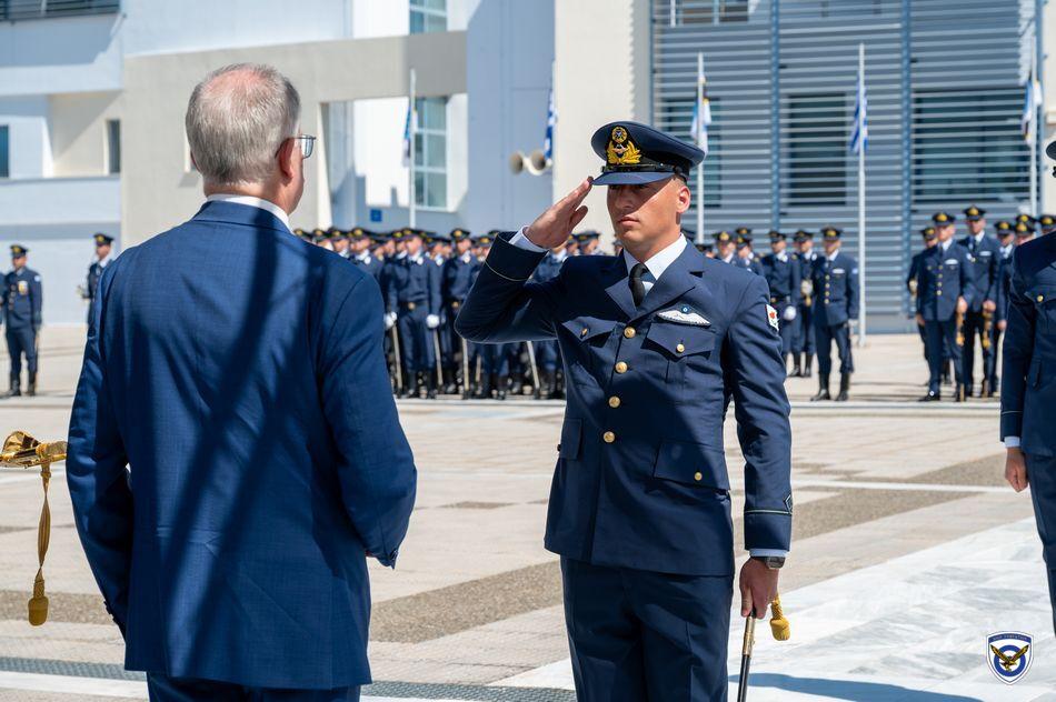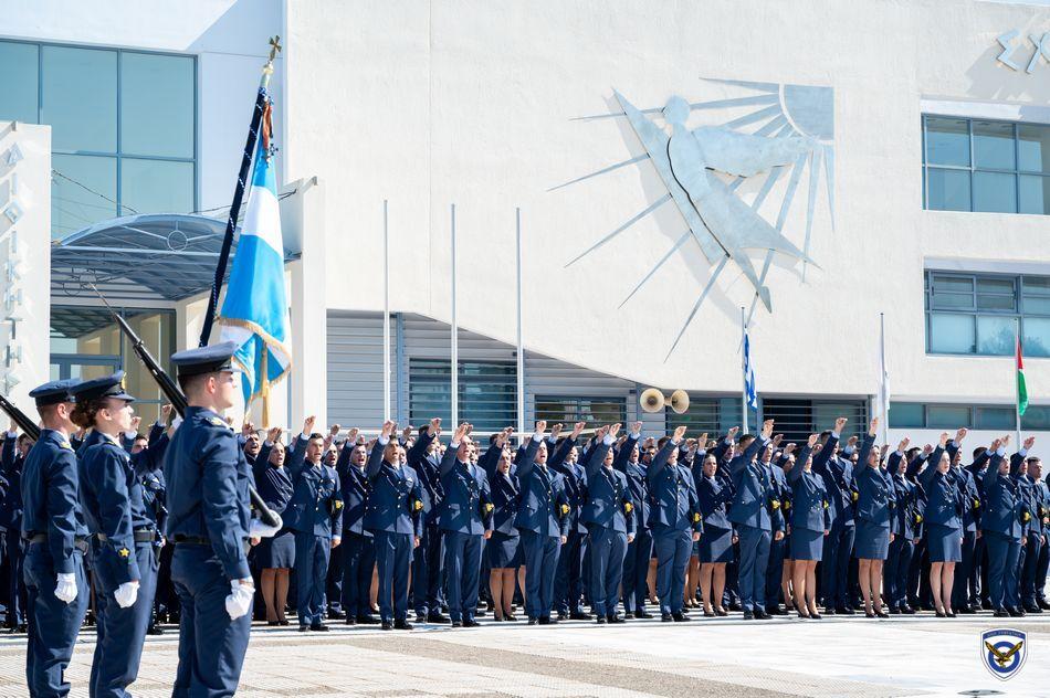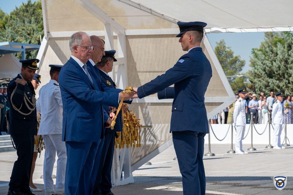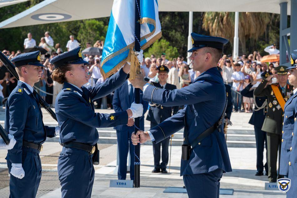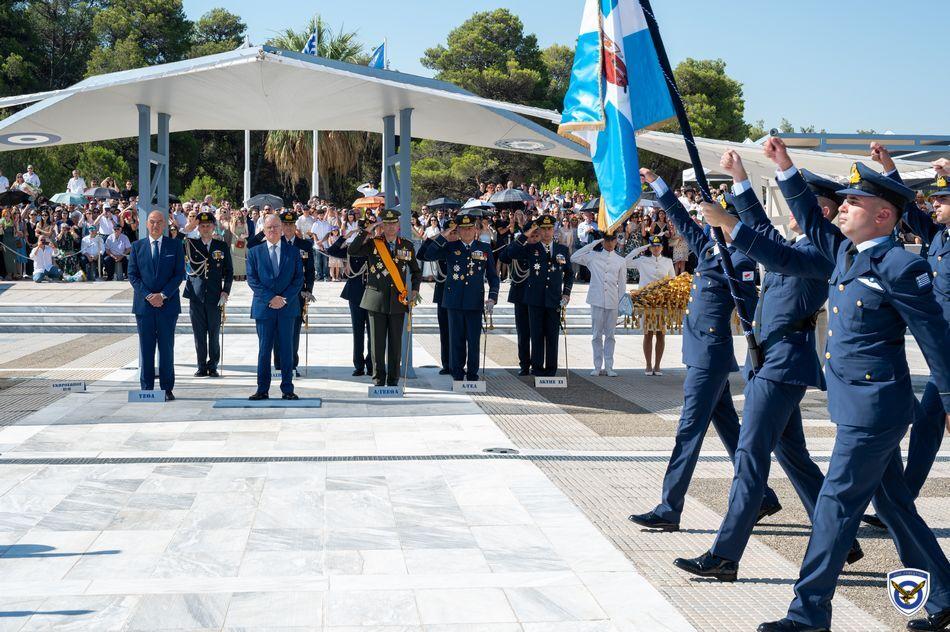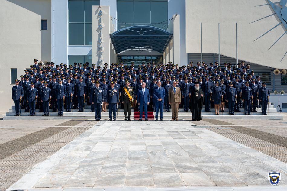 Η τελετή ορκωμοσίας και επιδόσεως ξιφών στους νέους Ανθυποσμηναγούς της Πολεμικής Αεροπορίας πραγματοποιήθηκε στις εγκαταστάσεις της Σχολής  Ελληνικής Δημοκρατίας κ. Κωνσταντίνου Τασούλα και του Υπουργού Εθνικής Αμύνης κ. Νίκου Δένδια ως εκπροσώπου της Κυβερνήσεως.