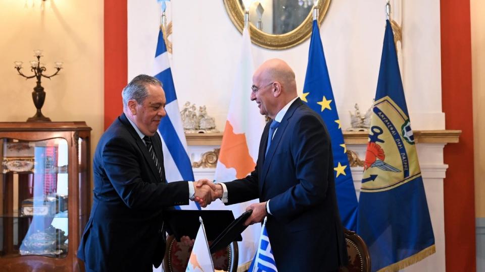 Τελετή υπογραφής Μνημονίου Συνεργασίας Ελλάδος και Κυπριακής Δημοκρατίας για την προώθηση κοινών προγραμμάτων Ερεύνης και Αναπτύξεως μεταξύ των δύο χωρών υπογράφτηκε σήμερα στην Αθήνα, από τους Υπουργούς Εθνικής Αμύνης της Ελλάδος κ. Νίκο Δένδια και Αμύνης της Κύπρου κ. Βασίλη Πάλμα αντιστοίχως.
