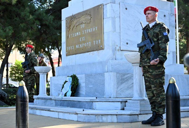 Πριν την παρέλαση, ο κ. Δένδιας παρέστη στην τελετή καταθέσεως στεφάνου από την Πρόεδρο της Δημοκρατίας στο Ηρώο του Γ’ Σώματος Στρατού.