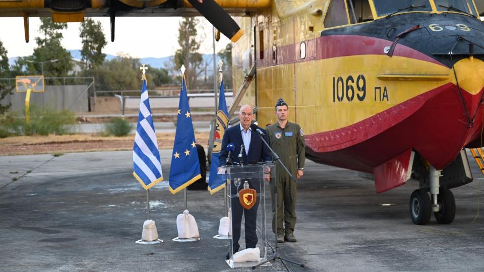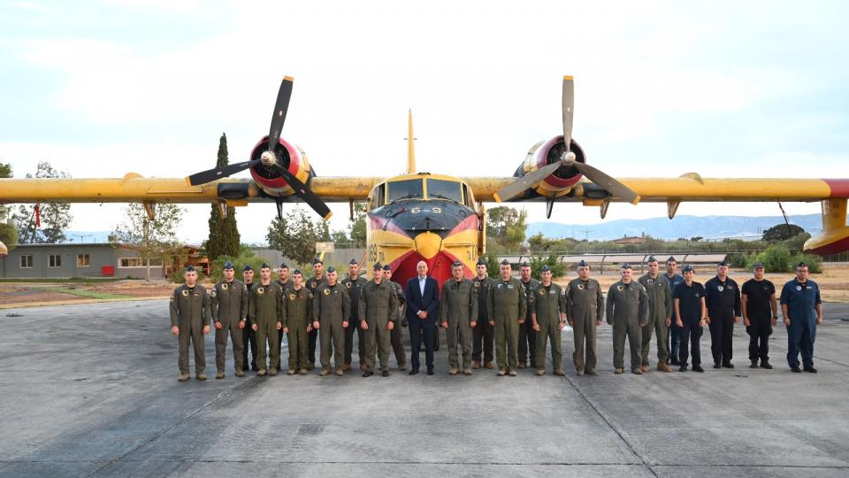 Και θα ήθελα να συγχαρώ όλο το προσωπικό. Το ιπτάμενο, το τεχνικό που βρίσκεται σε μια διαρκή τεχνική εγρήγορση. Και επί 24 ώρες το 24ωρο μάχεται ώστε τα πτητικά μέσα να είναι έτοιμα να συντρέξουν αποτελεσματικά το δύσκολο έργο και της πυρόσβεσης και των αεροδιακομιδών…»
