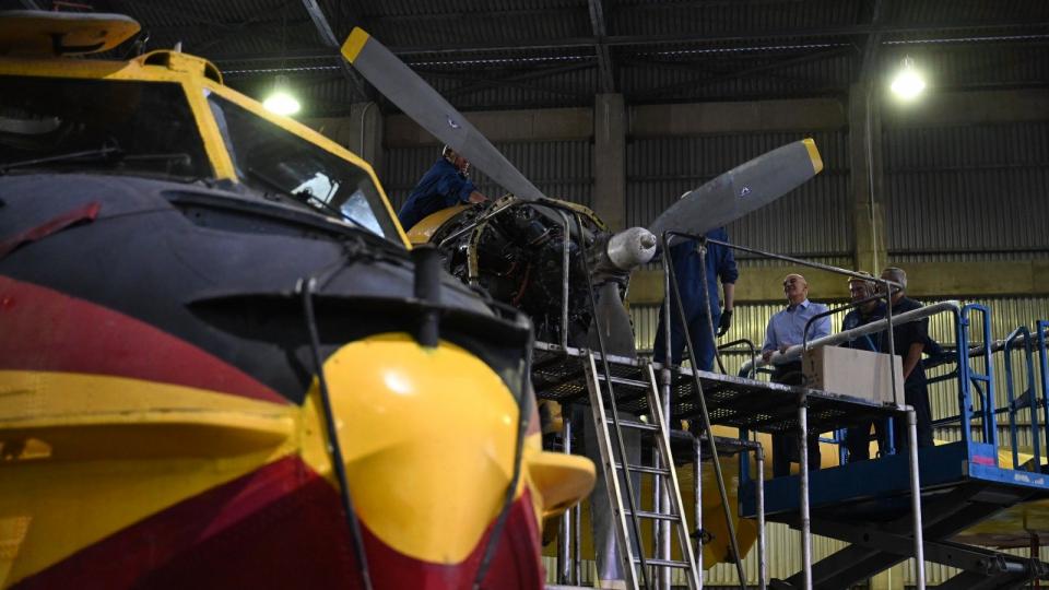 Ακολούθως, ο κ. Δένδιας παρακολούθησε επίδειξη-παρουσίαση των δασοπυροσβεστικών αεροσκαφών Canadair CL-215 της 355 ΜΤΜ και Canadair CL-415 της αδελφής 383 Μοίρας Ειδικών Επιχειρήσεων Αεροπυροσβέσεως (383 ΜΕΕΑ), που στη διάρκεια της δασοπυροσβεστικής περιόδου μετασταθμεύουν από τη βάση τους στη Θεσσαλονίκη, στην Ελευσίνα, ενώ περιηγήθηκε στη Μοίρα Συντηρήσεως Αεροσκαφών (ΜΣΑ), όπου συνομίλησε με ιπτάμενο, τεχνικό και διοικητικό προσωπικό.