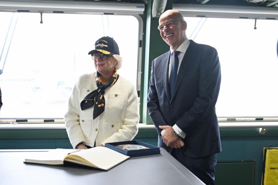 Η συνάντηση των δύο υπουργών πραγματοποιήθηκε στον Ναύσταθμο Σαλαμίνος και πιο συγκεκριμένως επί της ναυλοχούσης εκεί πρώτης ελληνικής φρεγάτας τύπου FDI-HN (“Belh@rra”) «ΚΙΜΩΝ» (F-601), που είναι και επικεφαλής της ομωνύμου κλάσεως, όπως επίσης εκεί (στο Ναύσταθμο) έγινε και η επίσημη υποδοχή της Γαλλίδος Υπουργού αντί – ως είθισται – στο Στρατόπεδο Παπάγου