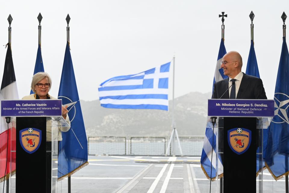 Την επιτάχυνση των διεργασιών για την ανανέωση της στρατηγικής συμφωνίας αμυντικής συνεργασίας, με ρήτρα αμοιβαίας συνδρομής, Ελλάδος και Γαλλίας, με σκοπό όπως αυτή υπογραφεί εντός των επόμενων 1-2 μηνών, ώστε να μην υπάρχει ούτε μία μέρα «κενή» από του πέρατος της ισχύουσας πενταετούς διάρκειας, που λήγει στο τέλος του τρέχοντος εξαμήνου, συζήτησαν και συμφώνησαν οι υπουργοί Εθνικής Αμύνης της Ελλάδος κ. Νίκος Δένδιας και «Ενόπλων Δυνάμεων και Υποθέσεων Παλαιμάχων» της Γαλλίας, όπως είναι ο πλήρης τίτλος της, κας Κατρίν Βοτρέν (Catherine Vautrin), που ολοκληρώθηκε πριν από λίγη ώρα, μετά το γεύμα που παρέθεσε ο Έλλην Υπουργός προς τη φιλοξενούμενή του.