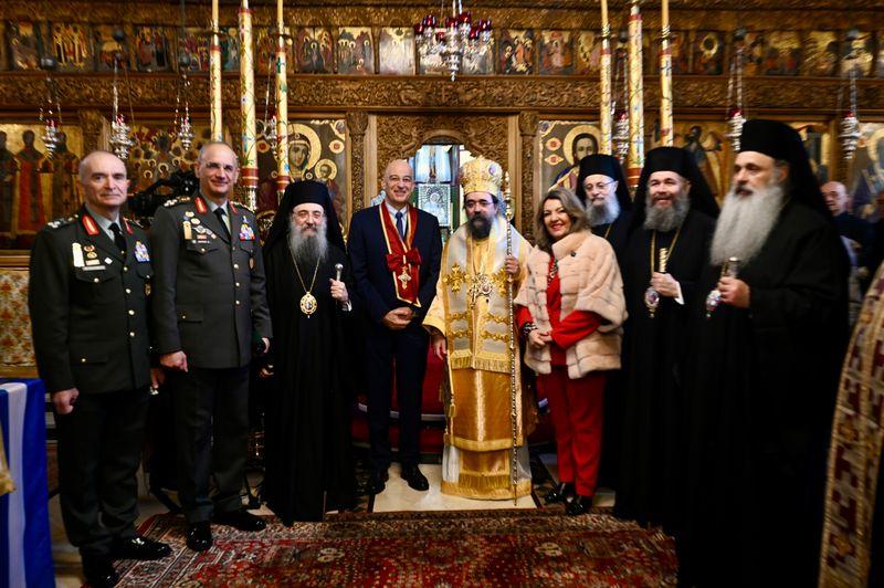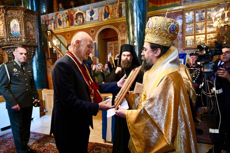 Ο Υπουργός Εθνικής Αμύνης, συνοδευόμενος από τους Αρχηγούς ΓΕΕΘΑ και ΓΕΣ, Στρατηγό Δημήτριο Χούπη και Αντιστράτηγο Γεώργιο Κωστίδη αντιστοίχως, παρακολούθησε αρχικώς την επίσημη Δοξολογία στον Ιερό Καθεδρικό Ναό Καστοριάς, στην οποία συλλειτούργησαν οι Σεβασμιώτατοι Μητροπολίτες Καστορίας κ.κ. Καλλίνικος, Πατρών κ.κ. Χρυσόστομος, Φλωρίνης, Πρεσπών και Εορδαίας κ.κ. Ειρηναίος καθώς και ο Φθιώτιδος κ.κ. Συμεών. Ο κ. Δένδιας τιμήθηκε από τον Μητροπολίτη Καστορίας κ.κ. Καλλίνικο με τον Σταυρό του Αγίου Μηνά, μαζί με την ιερή εικόνα του Αγίου Καλλινίκου και πίνακα του ιστορικού Ναού Καστοριάς.