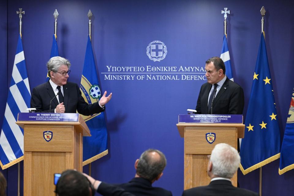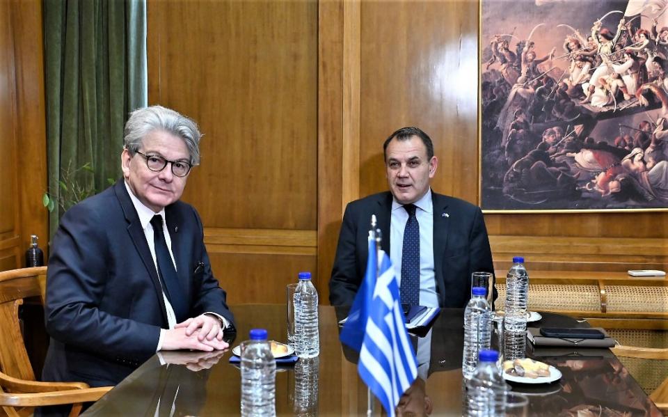 Θέματα υποστηρίξεως των αμυντικών βιομηχανιών, ενόψει υποβολής συγκεκριμένων προτάσεων της Ευρωπαϊκής Επιτροπής για μέτρα ενισχύσεως και αυξήσεως της παραγωγικής ικανότητος της Ευρωπαϊκής Αμυντικής Βιομηχανίας αποτέλεσαν το αντικείμενο της σημερινής συναντήσεως του Υπουργού Εθνικής Αμύνης Νικόλαου Παναγιωτόπουλου με τον Ευρωπαίο Επίτροπο Εσωτερικής Αγοράς, Τιερύ Μπρετόν, ο οποίος επισκέφθηκε την Ελλάδα, στο πλαίσιο συναντήσεών του με υπουργούς Αμύνης κρατών – μελών της Ευρωπαϊκής Ενώσεως και επισκέψεών του σε ευρωπαϊκές αμυντικές βιομηχανίες.