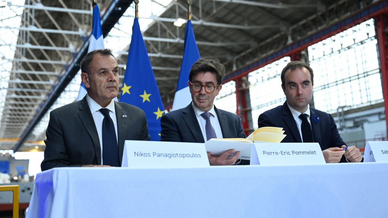Παράλληλα, ο κ. Παναγιωτόπουλος εξέφρασε τη μεγάλη ικανοποίησή του για την πρόοδο της ταυτόχρονης ναυπήγησης, στα ναυπηγεία της "Naval Group", της δεύτερης φρεγάτας 'Αμυνας και Επέμβασης, που προορίζεται για το ελληνικό Πολεμικό Ναυτικό και χαιρέτισε τη συνεργασία της Naval Group με ελληνικές εταιρείες της αμυντικής βιομηχανίας, "ως άλλωστε προβλέπεται και στη συμφωνία για την εγκαθίδρυση Στρατηγικής Εταιρικής Σχέσης μεταξύ Ελλάδας και Γαλλίας.