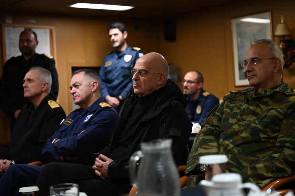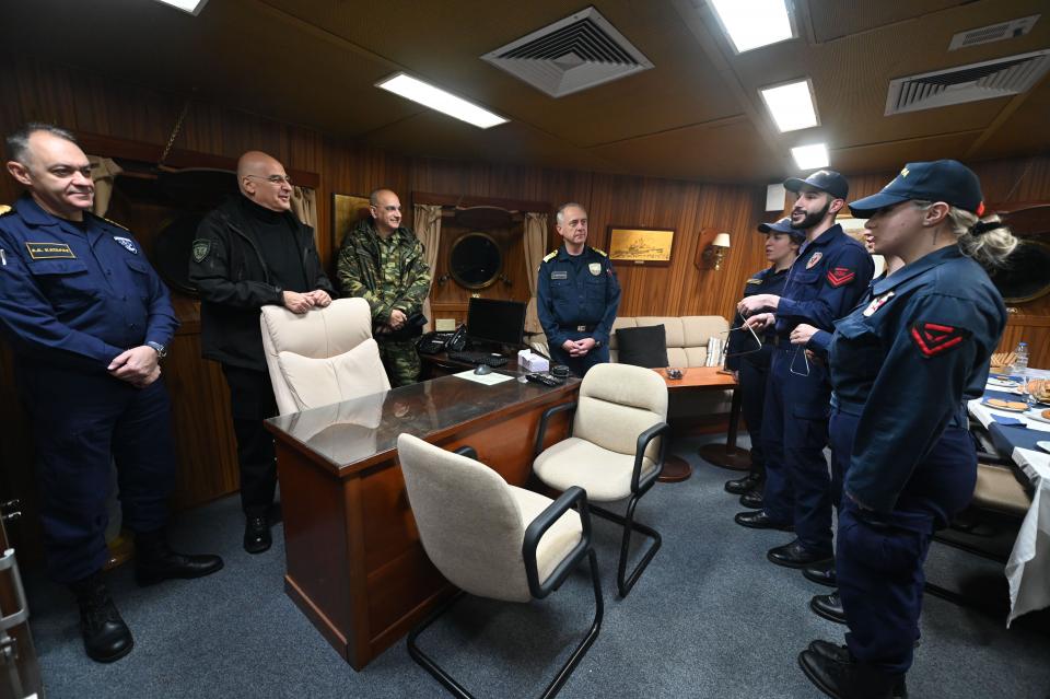 Ο κ. Δένδιας επισκέφθηκε χθες το απόγευμα τη φρεγάτα «ΨΑΡΑ» που έπλεε κατά τη διάρκεια «φυλακής σκοπούντος» κάπου στις Κυκλάδες και στην οποία παρέμεινε – ως προελέχθη – ως σήμερα το πρωί, συνοδευόμενος από τους Αρχηγούς ΓΕΕΘΑ Στρατηγό Δημήτριο Χούπη, ΓΕΝ Αντιναύαρχο Δημήτριο – Ελευθέριο Κατάρα ΠΝ και Στόλου Αντιναύαρχο Πολυχρόνη Κουλούρη ΠΝ.
