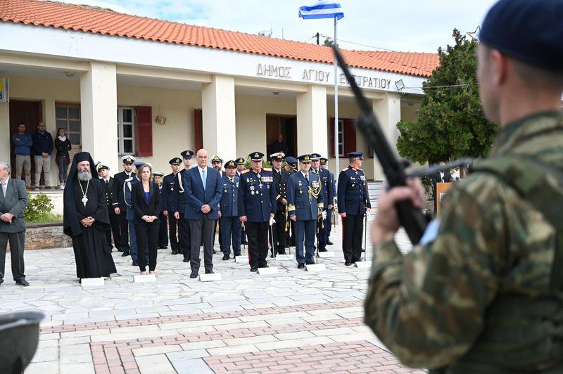 Στο πλαίσιο των εκδηλώσεων για την επέτειο ο κ. Δένδιας, ο οποίος συνοδευόταν από τον Διοικητή της ΑΣΔΕΝ Αντιστράτηγο Σωτήριο Κωστάκογλου και τον Επιτελάρχη ΓΕΑ Υποπτέραρχο (Ι) Ιωάννη Μπιρμπίλη, παρέστη στη Δοξολογία στον Ιερό Ναό της Γεννήσεως του Χριστού, που τέλεσε ο Αρχιμανδρίτης Κύριλλος, ως εκπρόσωπος του Μητροπολίτη Λήμνου και Αγίου Ευστρατίου κ.κ. Ιερόθεου, ενώ παρακολούθησε την επιμνημόσυνη δέηση στον χώρο του Μνημείου Πεσόντων Αγιοστρατιτών και κατέθεσε στεφάνι στο Μνημείο. Οι εκδηλώσεις ολοκληρώθηκαν με την παρέλαση μαθητών της πρωτοβαθμίου και δευτεροβαθμίου εκπαιδεύσεως και Ουλαμού της 88ης Στρατιωτικής Διοικήσεως (88η ΣΔΙ).
