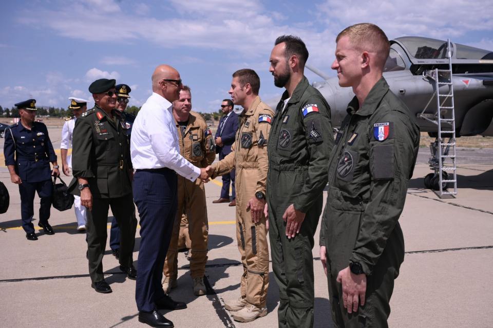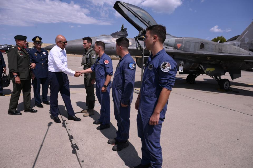 Στην Τανάγρα ο κ. Δένδιας συναντήθηκε, μεταξύ άλλων, με τις ομάδες μεμονωμένων αεροπορικών επιδείξεων της Γαλλίας (Rafale), των ΗΠΑ (F-35), όπως και με την ομάδα «Ζεύς» της Πολεμικής Αεροπορίας με μαχητικό αεροσκάφος F-16 Block 52+.