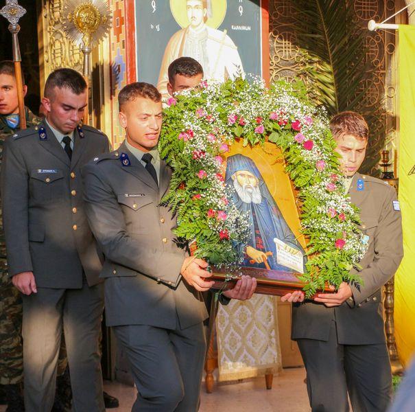 Ο Μέγας Πανηγυρικός Εσπερινός πραγματοποιήθηκε στον Ιερό Ναό των Αγίου Γεωργίου, Προστάτη του Στρατού Ξηράς και Αγίου Παϊσίου, Προστάτη των Διαβιβάσεων, που βρίσκεται εντός του χώρου του Στρατοπέδου.