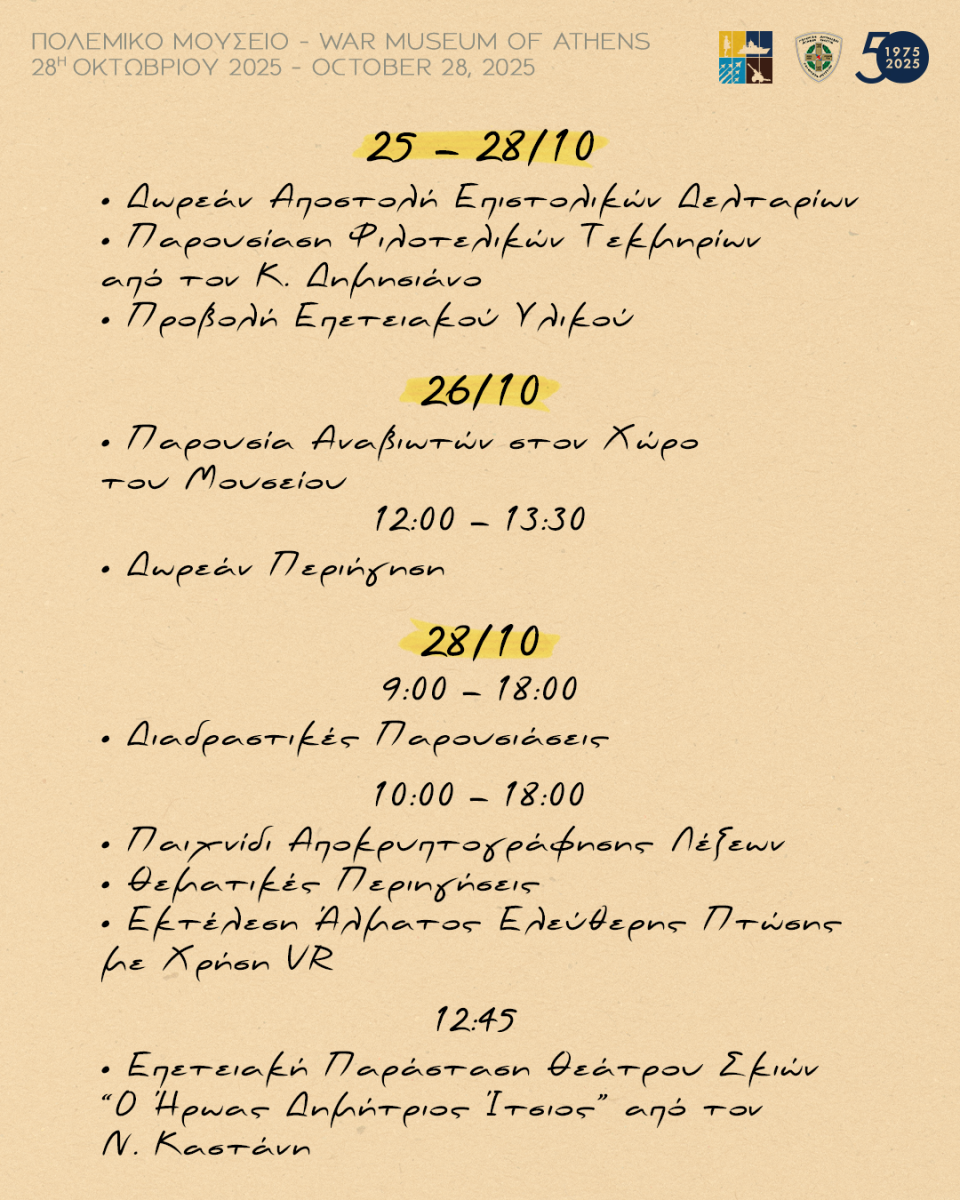 --- Δωρεάν αποστολή συλλεκτικών/αριθμημένων «Επιστολικών Δελταρίων (καρτ ποστάλ) του 1940», σε οποιονδήποτε προορισμό εκτός Αθηνών, μέσω της Στρατιωτικής Ταχυδρομικής Υπηρεσίας (10:00 – 13:00).