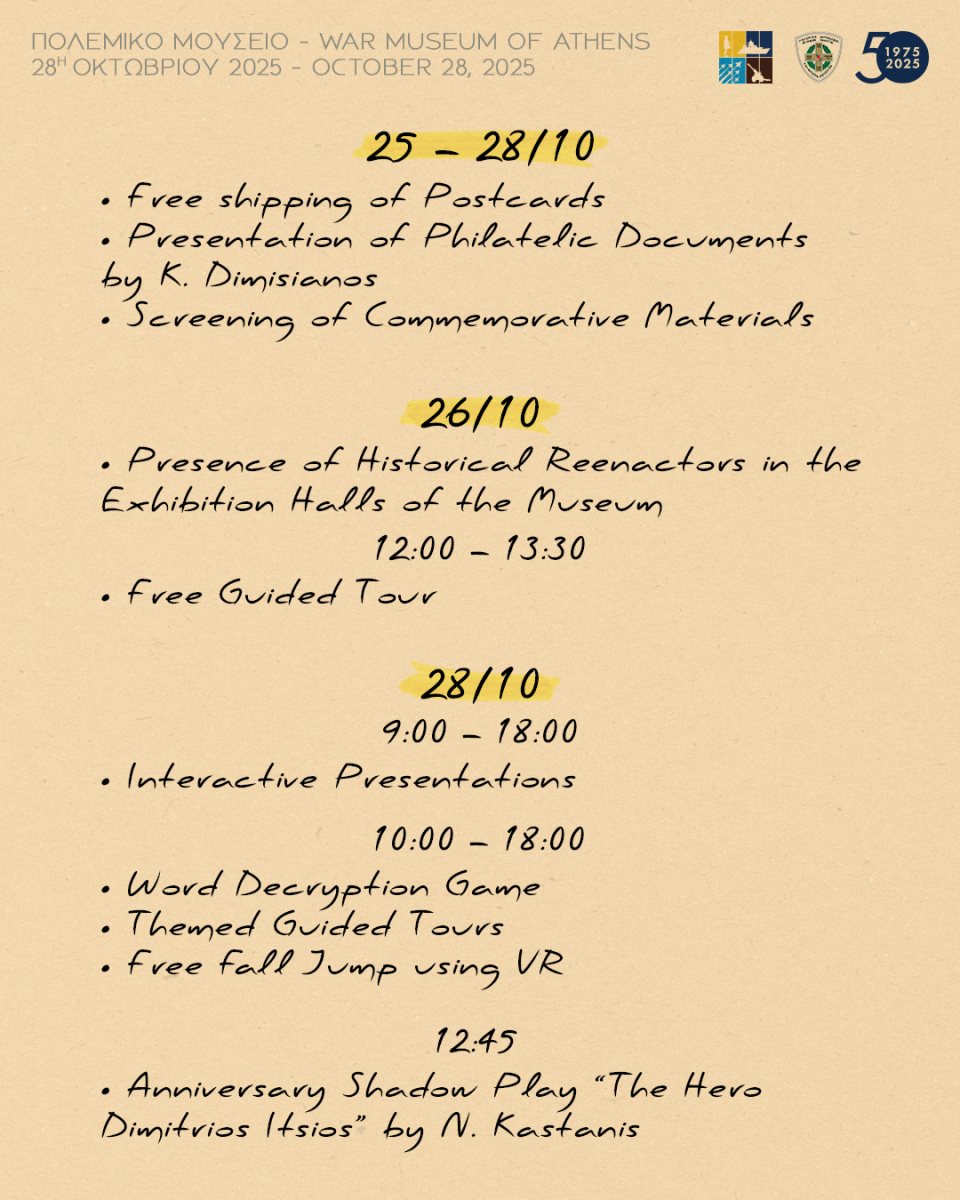--- Δωρεάν θεματικές περιηγήσεις στις αίθουσες και στο επετειακό διόραμα του 1940 (10:00-18:00).