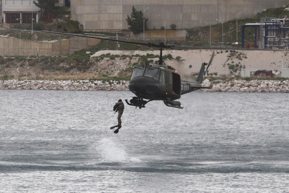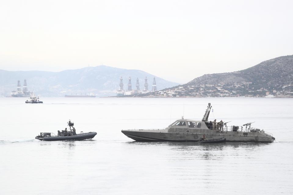 Στη θάλασσα, ομάδα εφόδου των δυνάμεων ειδικών επιχειρήσεων προχωρά με τη μέθοδο Fast Rope από ελικόπτερο Seahawk με την κάλυψη σκαφών, σε μη συναινετική νηοψία σε πλοίο που προσεγγίζει την εγκατάσταση της Ρεβυθούσας.