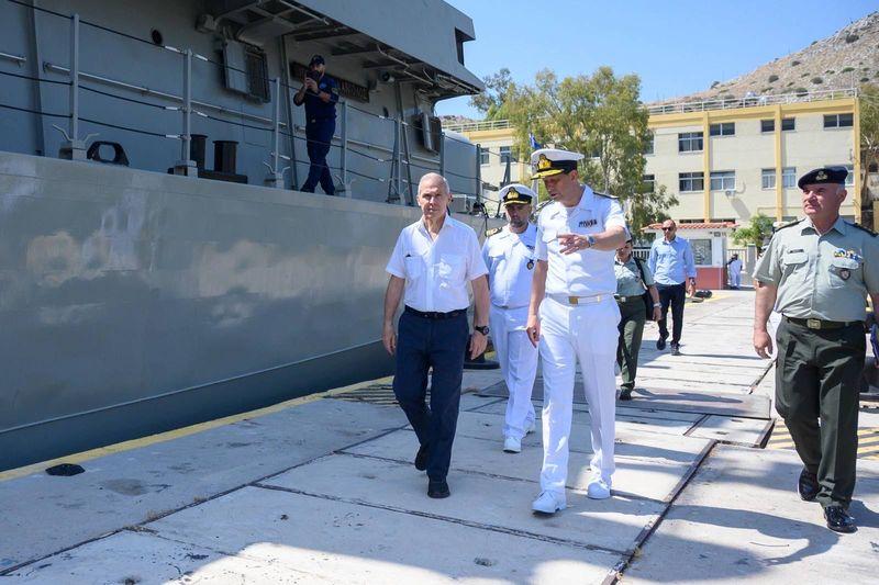 Στο Αρχηγείο Στόλου ο κ. Δαβάκης ενημερώθηκε για τη δομή, την αποστολή, τις παρούσες επιχειρησιακές και εκπαιδευτικές δραστηριότητες του Αρχηγείου, καθώς επίσης και για το επίπεδο της επιχειρησιακής ετοιμότητος των μονάδων του, ενώ ακολούθως επισκέφθηκε διαδοχικώς τη φρεγάτα «ΣΠΕΤΣΑΙ», τύπου MEKO-200HN, την πυραυλάκατο ΤΠΚ «ΔΑΝΙΟΛΟΣ», το υποβρύχιο «ΠΟΝΤΟΣ» τύπου Type-209/1200, καθώς και το υποβρύχιο «ΚΑΤΣΩΝΗΣ», τύπου Type-214AIP, όπου συνομίλησε αρκετή ώρα με ττους κυβερνήτες και μέλη των πληρωμάτων τους.