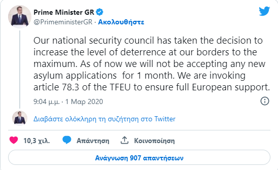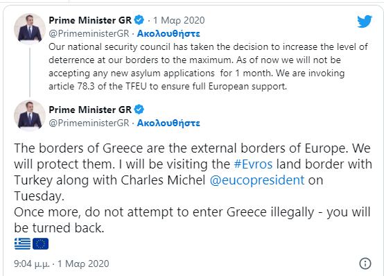 Στη συνέχεια, με δεύτερη ανάρτηση ο πρωθυπουργός υπογράμμισε ότι "τα εξωτερικά σύνορα της Ελλάδας είναι τα εξωτερικά σύνορα της Ευρώπης. Θα τα προστατεύσουμε. Θα επισκεφτώ τα ελληνοτουρκικά σύνορα στον Έβρο με τον Σαρλ Μισέλ".