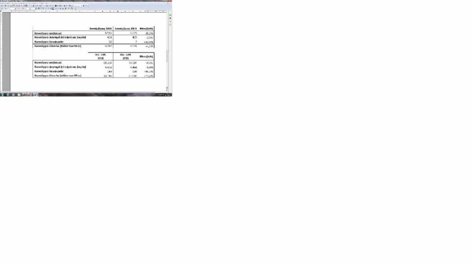 Συνολικά, στο εννεάμηνο Ιανουαρίου-Σεπτεμβρίου 2016 οι ταξινομήσεις καινούργιων επιβατικών είναι αυξημένες κατά +8,6% ως προς το αντίστοιχο διάστημα του 2015. Παραμένουν όμως να είναι -71,1% χαμηλότερα ως προς το μέσο όρο της δεκαετίας 2000-2009.
