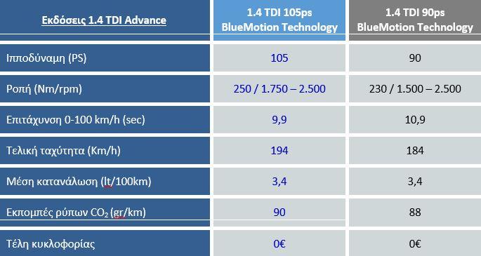 Ο νέος κινητήρας 1.4 TDI 105PS BlueMotion Technology προσφέρεται αποκλειστικά με μηχανικό κιβώτιο 5-σχέσεων σε 3θυρο και 5θυρο αμάξωμα και διατίθεται στις εκδόσεις ADVANCE και EXCLUSIVE με ιδιαίτερα πλούσιο βασικό εξοπλισμό.