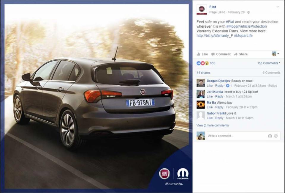 Από τον Μάρτιο του 2017 τα προϊόντα και οι υπηρεσίες της Mopar έχουν τη δική τους παρουσία και στα μέσα κοινωνικής δικτύωσης. Με την υπογραφή "At your service" θα υπάρχουν ειδικές αναφορές για το aftersales στις σελίδες της Fiat και της Alfa Romeo σε Facebook, Instagram και Twitter. Με αυτόν τον τρόπο η Mopar μπορεί να προσεγγίσει τους πελάτες της FCA πιο αποτελεσματικά, μέσα από ειδικά διαμορφωμένα μηνύματα.