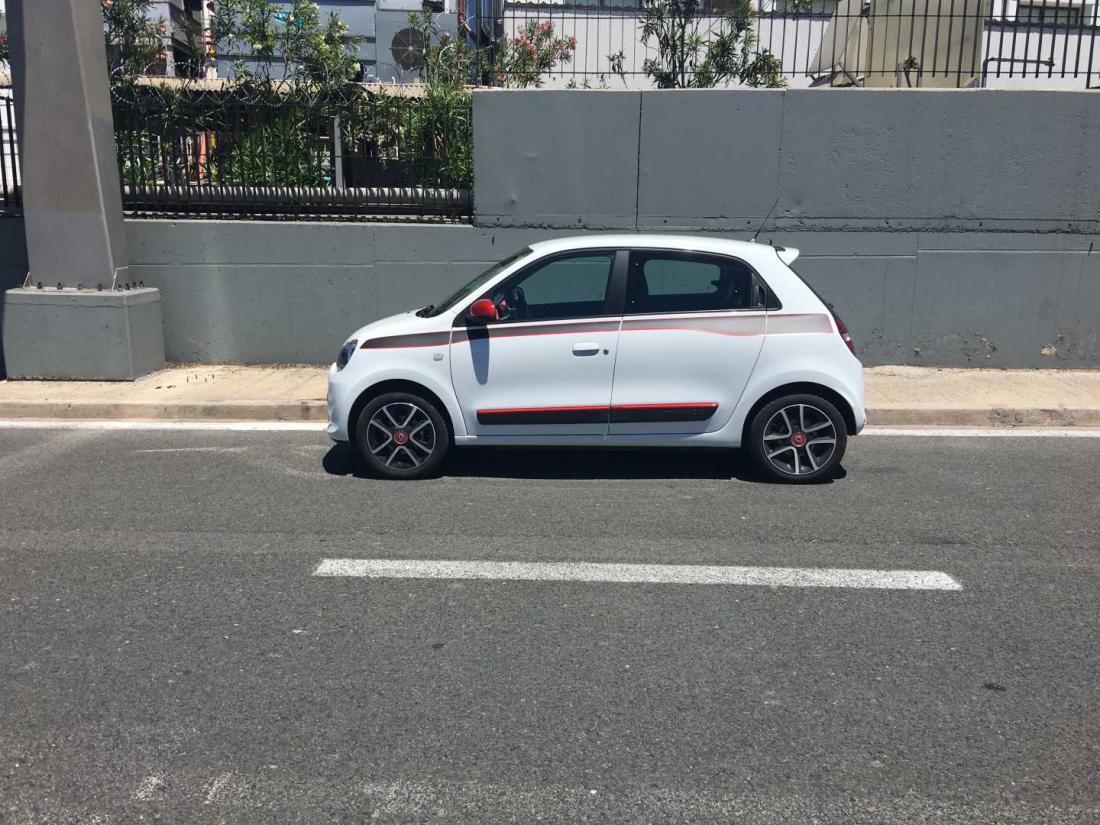 Στο μπροστινό μέρος του αυτοκινήτου ξεχωρίζουν τα στρογγυλά LED φώτα ημέρας και λίγο χαμηλότερα οι στρογγυλοί προβολείς ομίχλης. Μου άρεσαν ακόμη οι χειρολαβές των πίσω θυρών. Αυτός που τις σκέφθηκε είχε έμπνευση. Το Twingo με τις σπόρ – αγωνιστικές του πινελιές , έχει δίχρωμες γυαλιστερές ζάντες αλουμινίου, κόκκινες πινελιές στη μάσκα , αεροτομή οροφής και μαύρες λωρίδες κατά μήκος του αμαξώματος.
