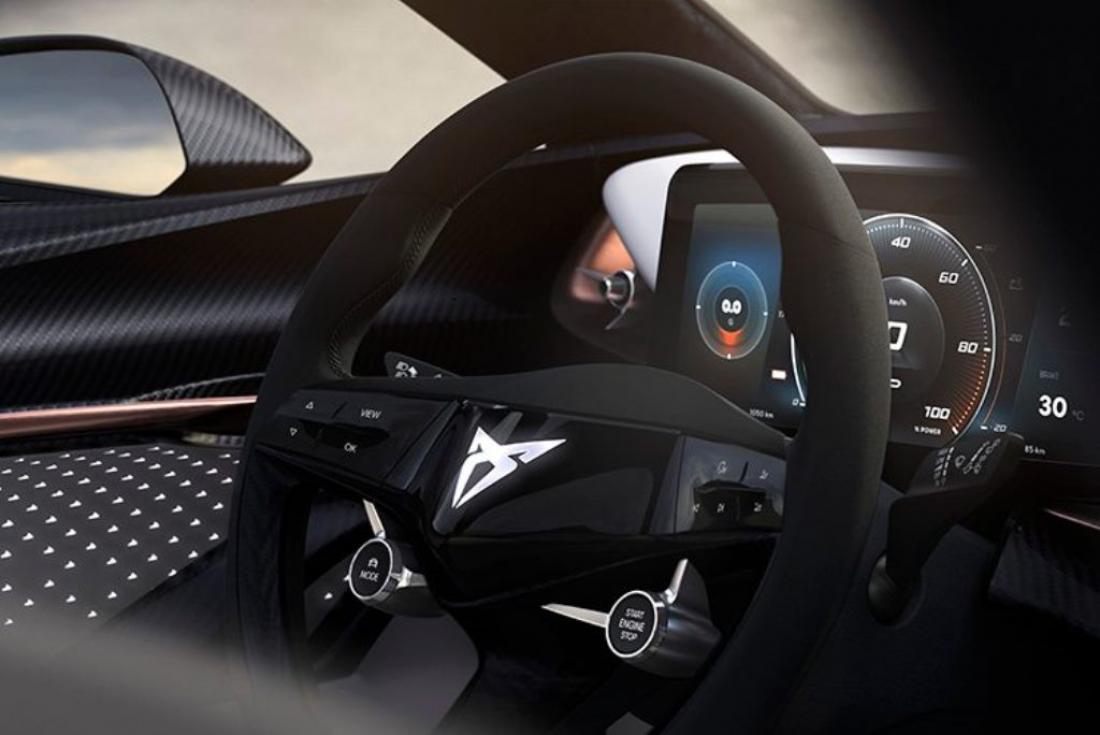 Πρώτη γεύση από το εσωτερικό του ηλεκτρικού πρωτότυπου της CUPRA .Μην σας μπερδεύει το τιμόνι. Δεν πρόκειται για κάποια αγωνιστική έκδοση. Είναι το τιμόνι του πρώτου πλήρως ηλεκτρικού αυτοκινήτου της μάρκας .Η καμπίνα είναι εστιασμένη κυρίως στον οδηγό, παρέχοντας ταυτόχρονα άνεση σε όλους τους επιβάτες.
