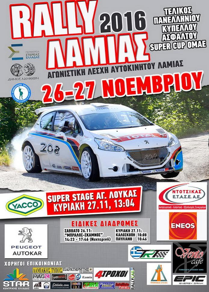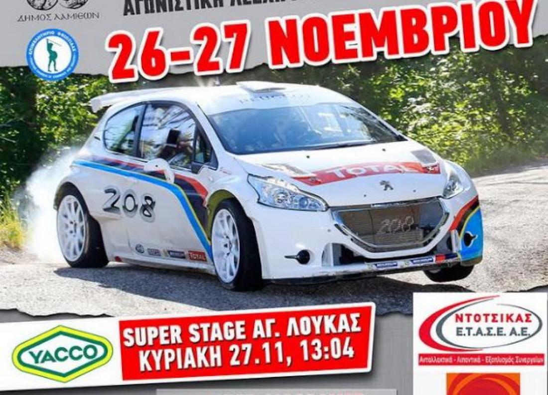 Μάλιστα, η διαδρομή θα επαναληφθεί λίγο αργότερα ως νυχτερινή, με τους ήχους και το φωτισμό των αγωνιστικών αυτοκινήτων, να φέρνουν στο νου τον Μπράλο παλαιότερων εποχών. Την Κυριακή 27 Νοεμβρίου, το Ράλλυ Λαμίας περιλαμβάνει από ένα πέρασμα στις Ειδικές Διαδρομές Καλοσκοπή και Παύλιανη, με μήκος 13,17 και 15,2 χιλιομέτρων αντίστοιχα, ενώ ο αγώνας θα ολοκληρωθεί με την Υπερειδική Διαδρομή Άγιος Λουκάς, που διεξήχθη με επιτυχία για πρώτη φορά το 2015, μέσα στην πόλη της Λαμίας.