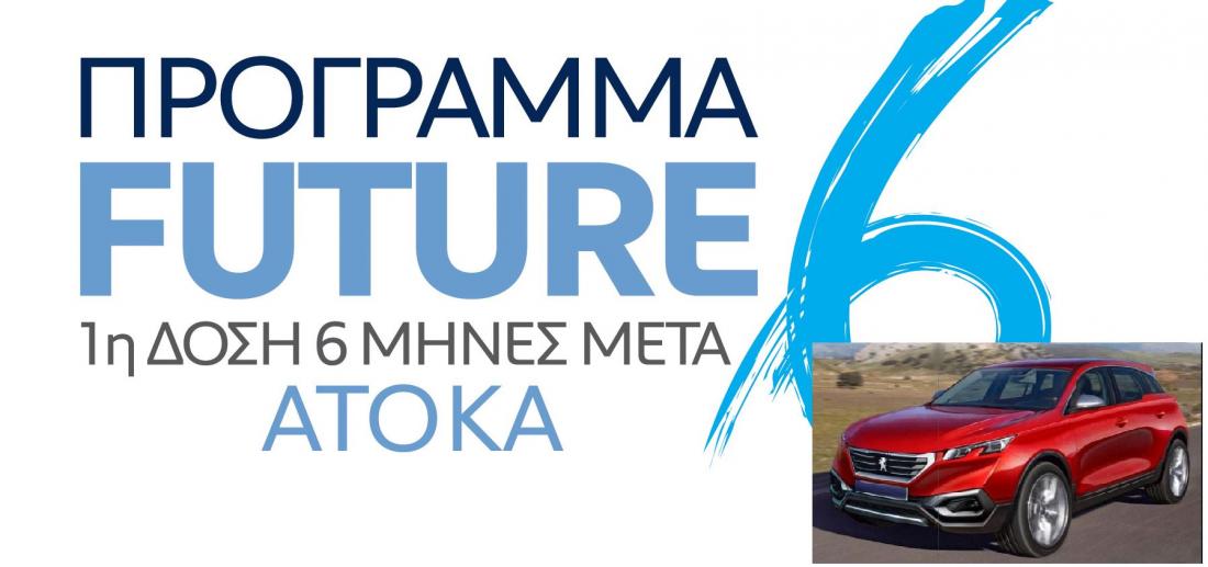 Με το πρόγραμμα Peugeot Future 6, οι πελάτες της μάρκας μπορούν να αγοράσουν σήμερα το καινούργιο τους Peugeot και να αρχίσουν να αποπληρώνουν τις δόσεις τους ύστερα από 6 μήνες, άτοκα. Θα είναι απόλυτα εξασφαλισμένοι, με 5 χρόνια Εργοστασιακής Εγγύησης αλλά θα κερδίσουν και ακόμα περισσότερα καθώς με το Όφελος Νέας Τιμής εξασφαλίζουν τιμές αγοράς χαμηλότερες ακόμα και από αυτές τις απόσυρσης!