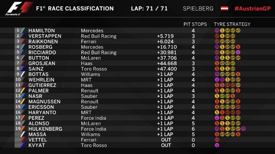 Τα δύο μονοθέσια είχαν επαφή στην προσπάθεια του Χάμιλτον να προσπεράσει, η μπροστινή αεροτομή του Ρόσμπεργκ έσπασε και ο περσινός παγκόσμιος πρωταθλητής πανηγύρισε την τρίτη νίκη του στη φετινή σεζόν, τη στιγμή που ο πρωτοπόρος της βαθμολογίας υποχρεώθηκε να φτάσει... τσουλώντας ως τον τερματισμό και να μείνει στην τέταρτη θέση, πίσω από τον Ολλανδό Μαξ Φερστάπεν (Red Bull) και τον Φινλανδό Κίμι Ραϊκόνεν (Φεράρι).