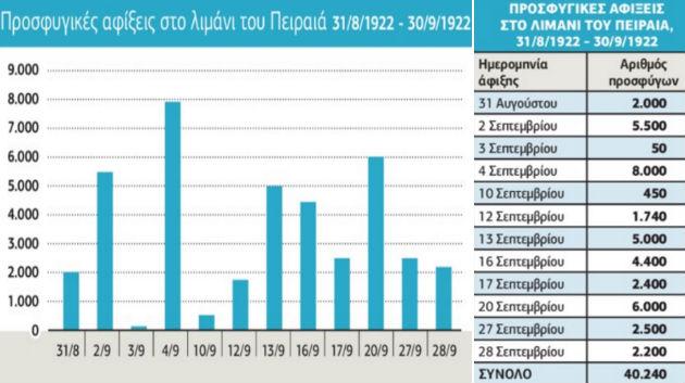 Τριάντα πέντε ατμόπλοια και ένα υπερωκεάνιο, με επιβάτες περισσότερους από 40.000 πρόσφυγες από τα μικρασιατικά παράλια, προσέδεσαν στο λιμάνι του Πειραιά και στον γειτονικό όρμο Κερατσινίου από την 1η έως τις 30 Σεπτεμβρίου του 1922.