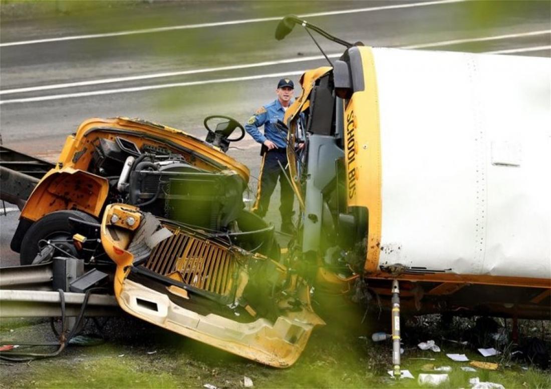 Το σχολικό ανατράπηκε στη μέση του δρόμου, στο διαχωριστικό ανάμεσα στα δύο ρεύματα κυκλοφορίας και μετατράπηκε σε μάζα από λαμαρίνες