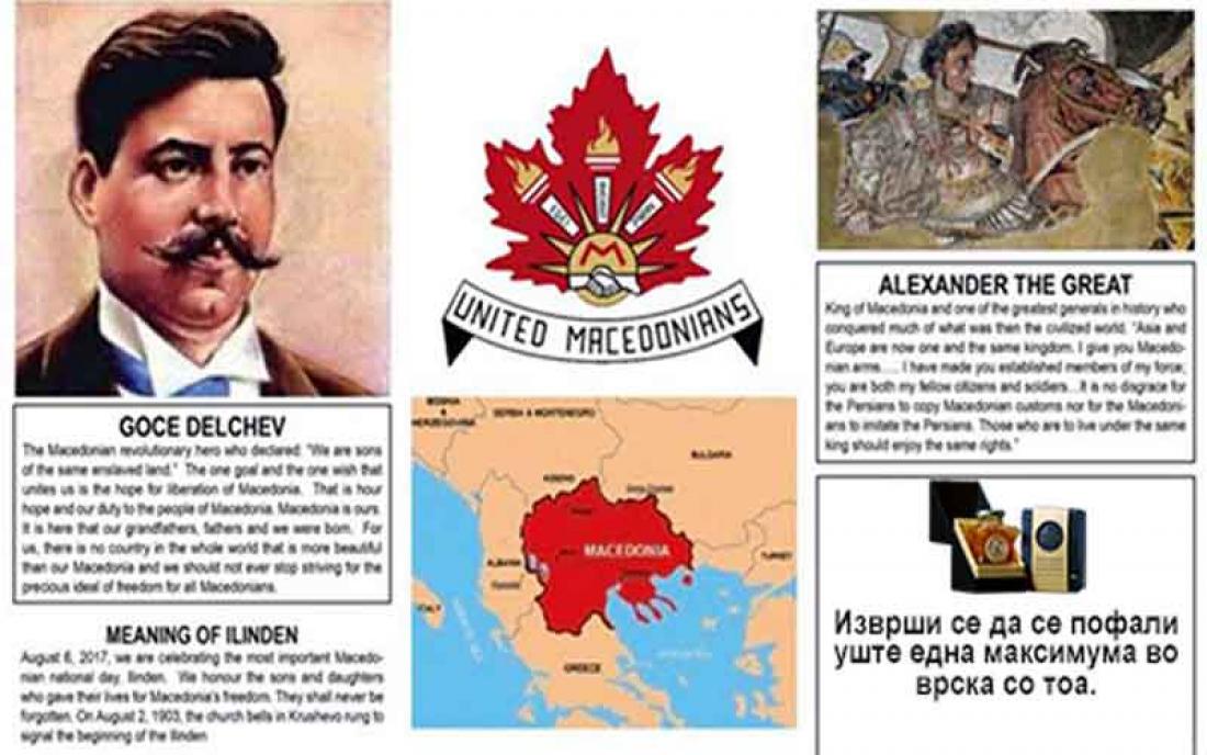 Η ένωση των εθνικιστών Σκοπιανών του Καναδά με επιστολή τους ζητούν από την εταιρεία “Greece to you” να αποσύρει όλα τα προϊόντα της που εστάλησαν στον Καναδά και αναγράφουν ως περιοχή προέλευσης την Μακεδονία και ως χώρα προέλευσης φυσικά την Ελλάδα .