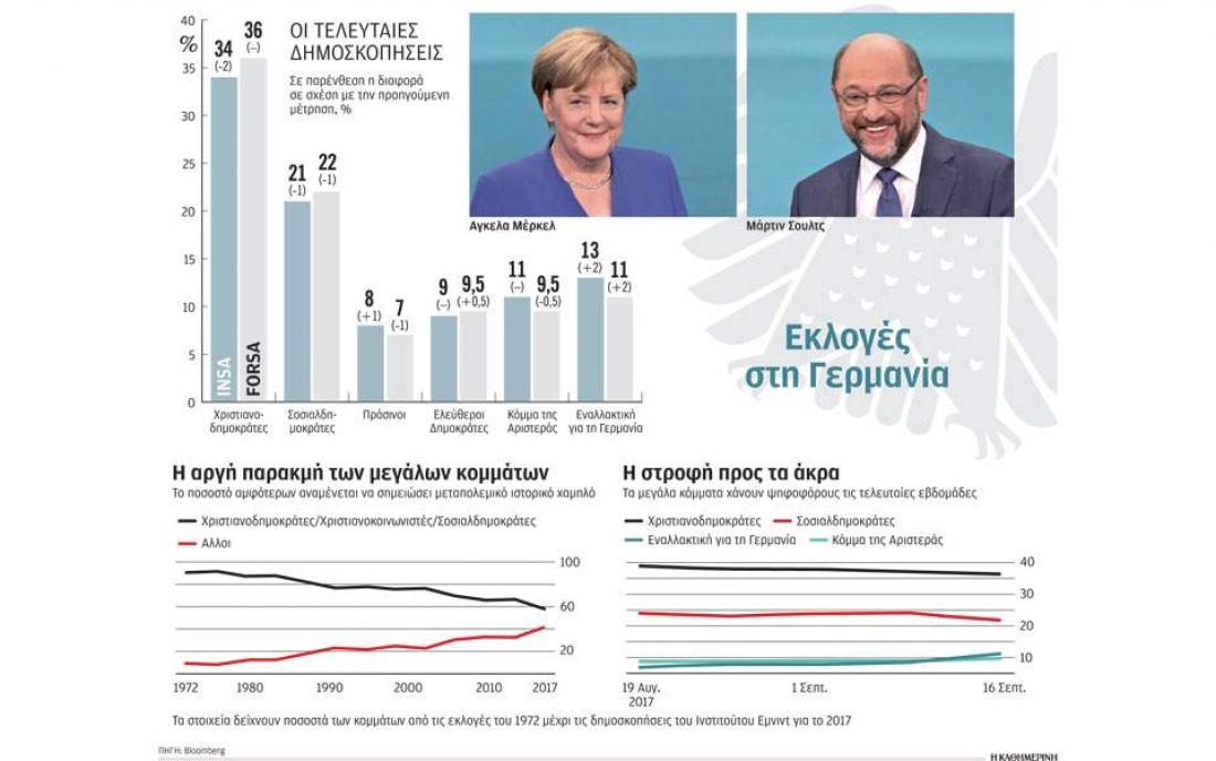 Γερμανικές εκλογές: Η συμμετοχή, το ποσοστό με το οποίο θα επανεκλεγεί η Αγκελα Μέρκελ, η επιρροή της ξενοφοβικής Εναλλακτικής για τη Γερμανία (AfD) και η επίδοση των μικρότερων κομμάτων, που θα καθορίσει τις πιθανές κυβερνήσεις συνεργασίας, είναι τα στοιχεία τα οποία θα πρέπει να παρακολουθήσουν με προσοχή οι Ελληνες αλλά και οι Ευρωπαίοι πολίτες σήμερα το βράδυ στις 7, όταν θα δημοσιοποιηθούν τα πρώτα exit-polls των γερμανικών εκλογών. Γιατί μπορεί η αναμέτρηση να μοιάζει προδιαγεγραμμένη, αλλά η σύνθεση της επόμενης κυβέρνησης στο Βερολίνο, καθώς και αυτή του νέου Μπούντεσταγκ, θα έχει μεγάλη σημασία για το μέλλον της Ευρώπης και φυσικά της χώρας μας.