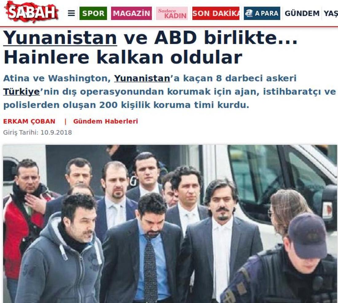 Προβοκατόρικο δημοσίευμα με τίτλο «Ελλάδα και ΗΠΑ έστησαν μαζί ασπίδα για τους προδότες» φιλοξενεί η φιλοκυβερνητική τουρκική εφημερίδα Sabah. Φαίνεται ότι το καθεστώς Ερντογάν στρέφεται πλέον και στην ελληνική κοινή γνώμη θέλοντας να την καταστήσει αρνητική απέναντι στους 8 Τούρκους αξιωματικούς . Για αυτό και προβάλλει το κόστος της φύλαξής τους.